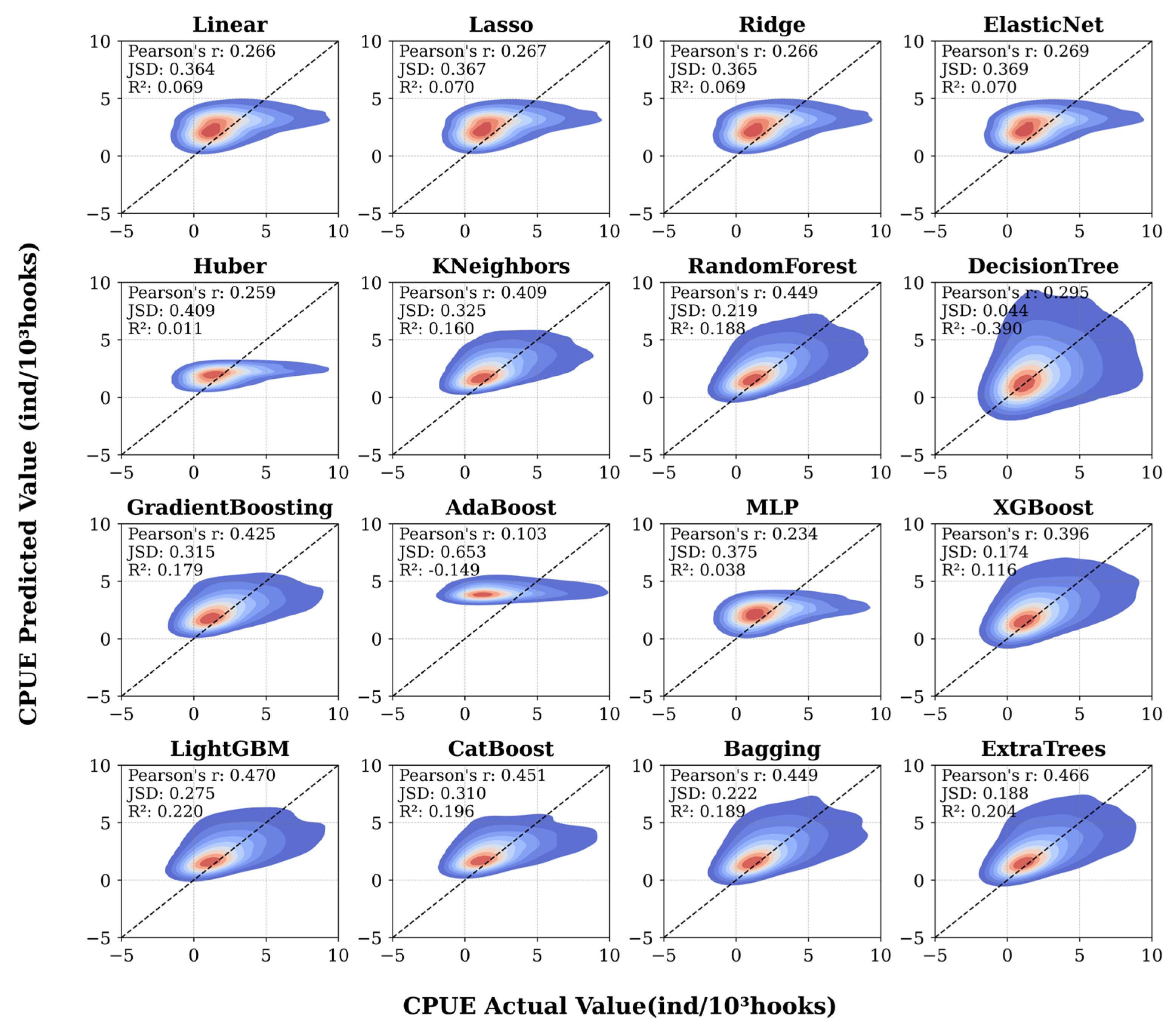 As shown in Figure 5, some models exhibit significant deviations from the diagonal line, indicating systematic errors in specific value ranges. In comparison, ensemble learning methods such as LightGBM and ExtraTrees demonstrate superior performance in terms of prediction concentration and alignment along the diagonal. The high density of scatter points near the diagonal line suggests strong predictive accuracy and consistency in distribution, which is essential for reliable modeling of Thunnus albacares catch per unit effort (CPUE).