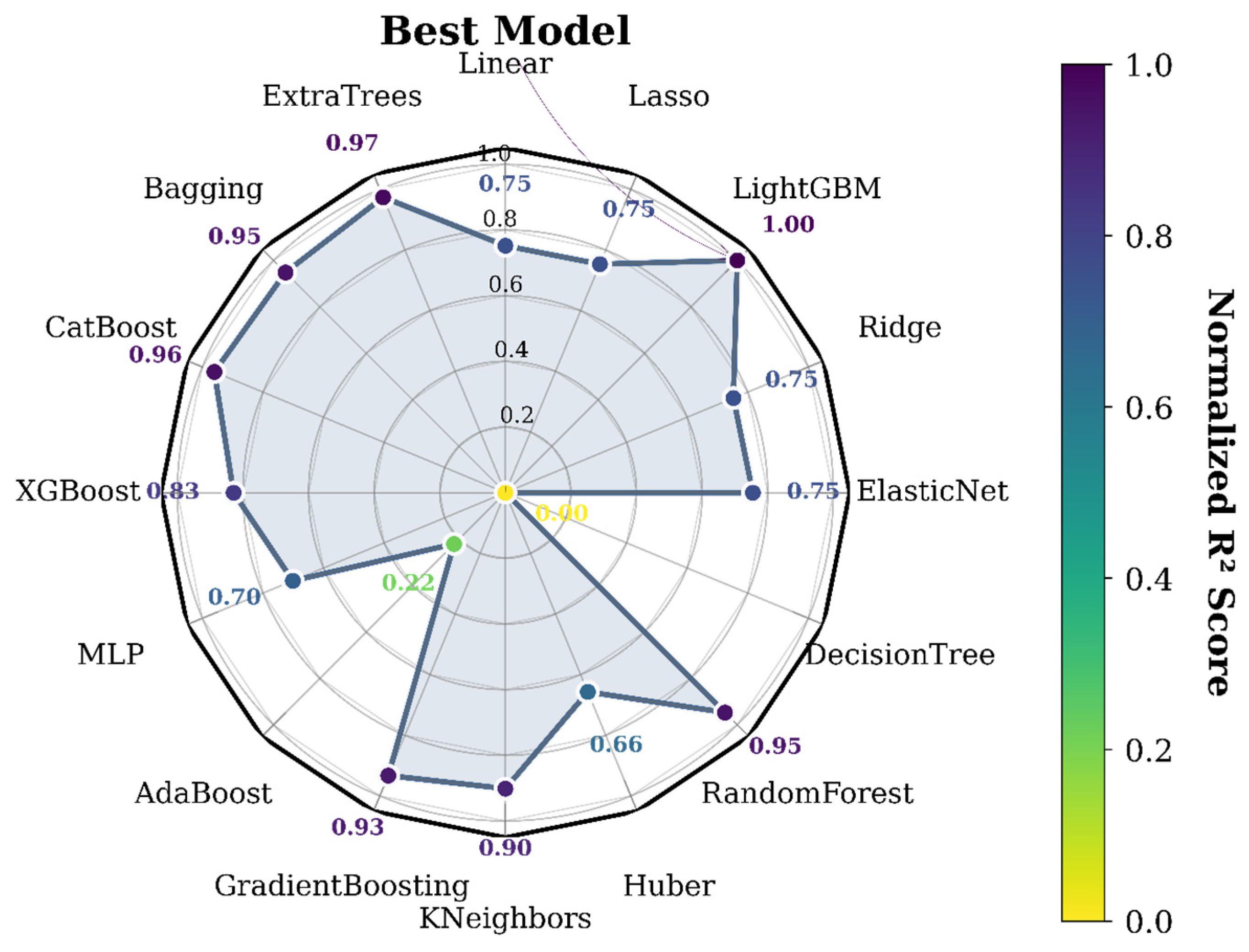 To further visualize and compare the performance of different models, this study employed a radar chart based on the standardized R2 scores, enabling an intuitive comparison of various machine learning algorithms and providing data-driven support for subsequent model selection and optimization. As shown in Figure 6, the values along the axes represent the performance scores of each model. The color gradient indicates the magnitude of the score, with higher scores represented by a deeper purple hue. The radar chart clearly illustrates the performance distribution across different evaluation metrics for each algorithm, highlighting that LightGBM demonstrates the most outstanding performance among all evaluated models.