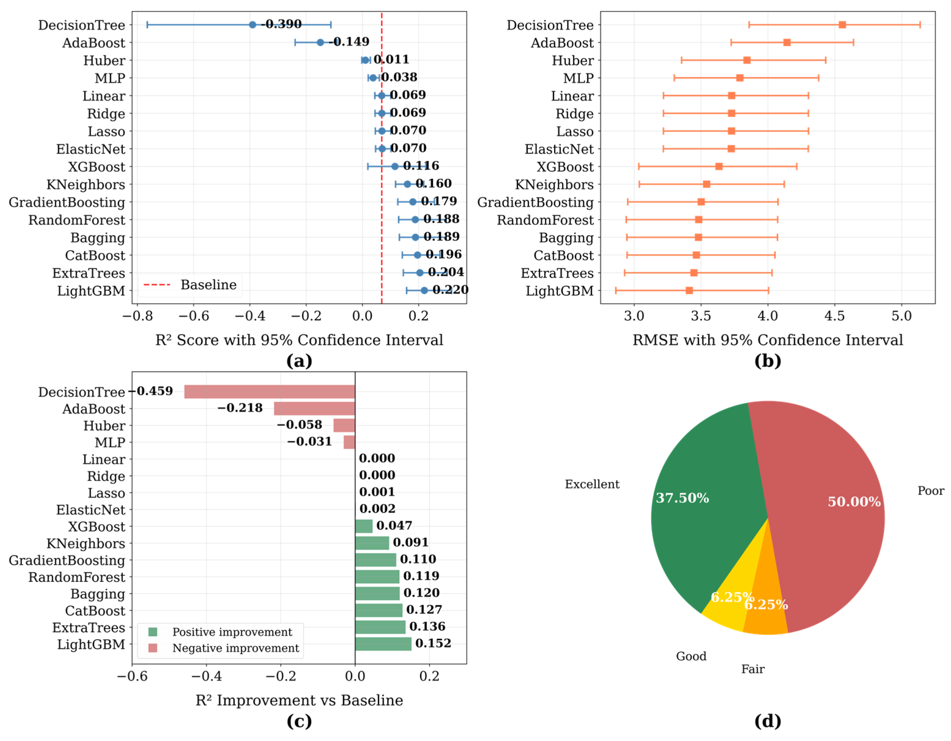 Figure 7. Model performance evaluation: (a) R2 scores and confidence intervals; (b) RMSE values and confidence intervals; (c) Relative R2 improvement; (d) Performance classification.