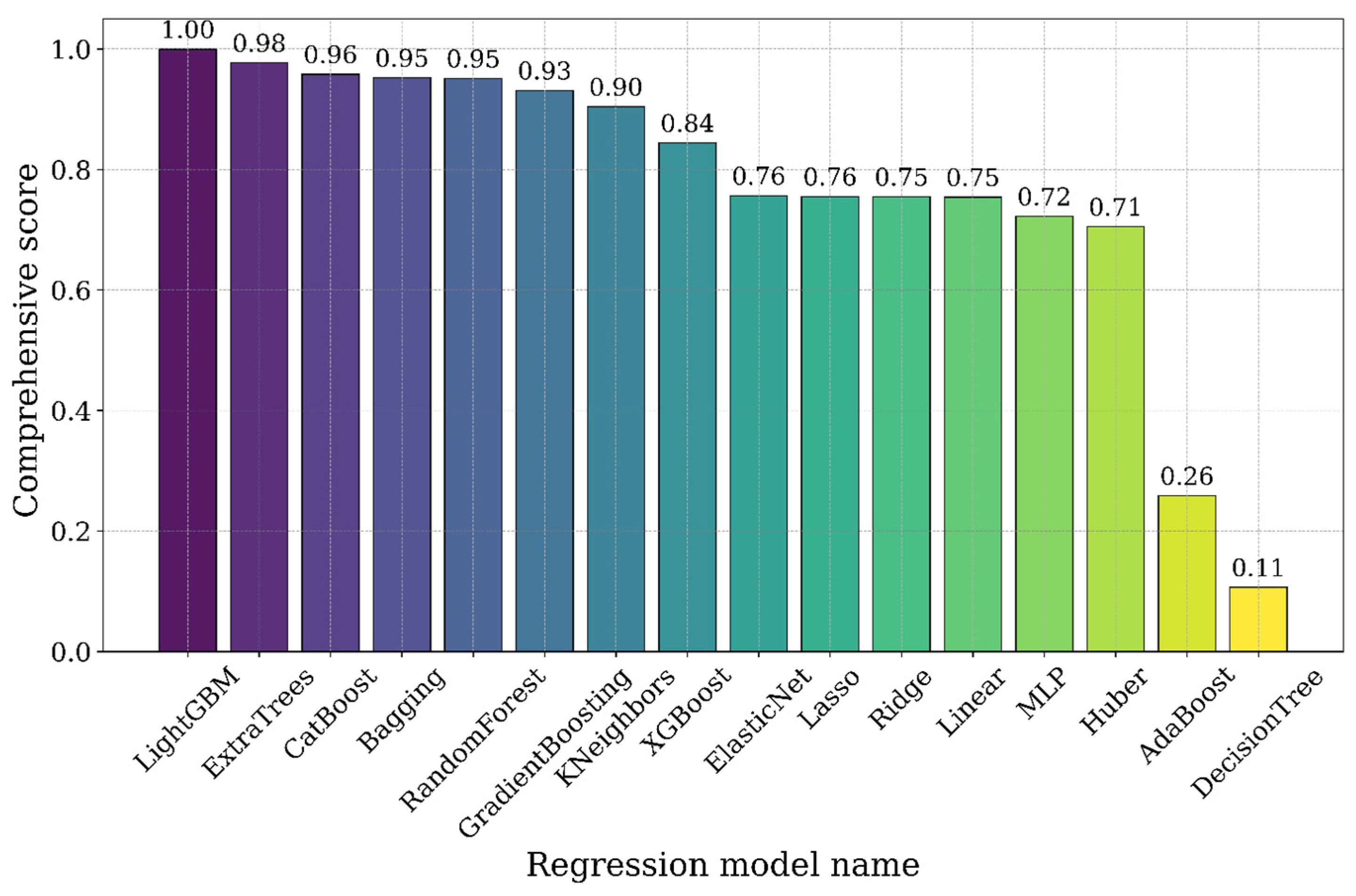 (8) To comprehensively evaluate the performance of the regression models, this study employed five key evaluation metrics: MAE, EVS, MSE, RMSE, and R2, and further derived a Composite Score. First, all metric values were normalized to ensure consistency in scale. For MAE, MSE, and RMSE, where lower values indicate better model performance, reverse normalization was applied. For EVS and R2, where higher values indicate better performance, direct normalization was used. Next, weighted aggregation was performed based on the relative importance of each metric. MAE, MSE, and RMSE were each assigned a weight of 0.5/3, while EVS and R2 were each assigned a weight of 0.25, summing to a total weight of 1 [10]. The Composite Score was calculated using the following formula, where X i represents the normalized score of the i-th model for a given metric.