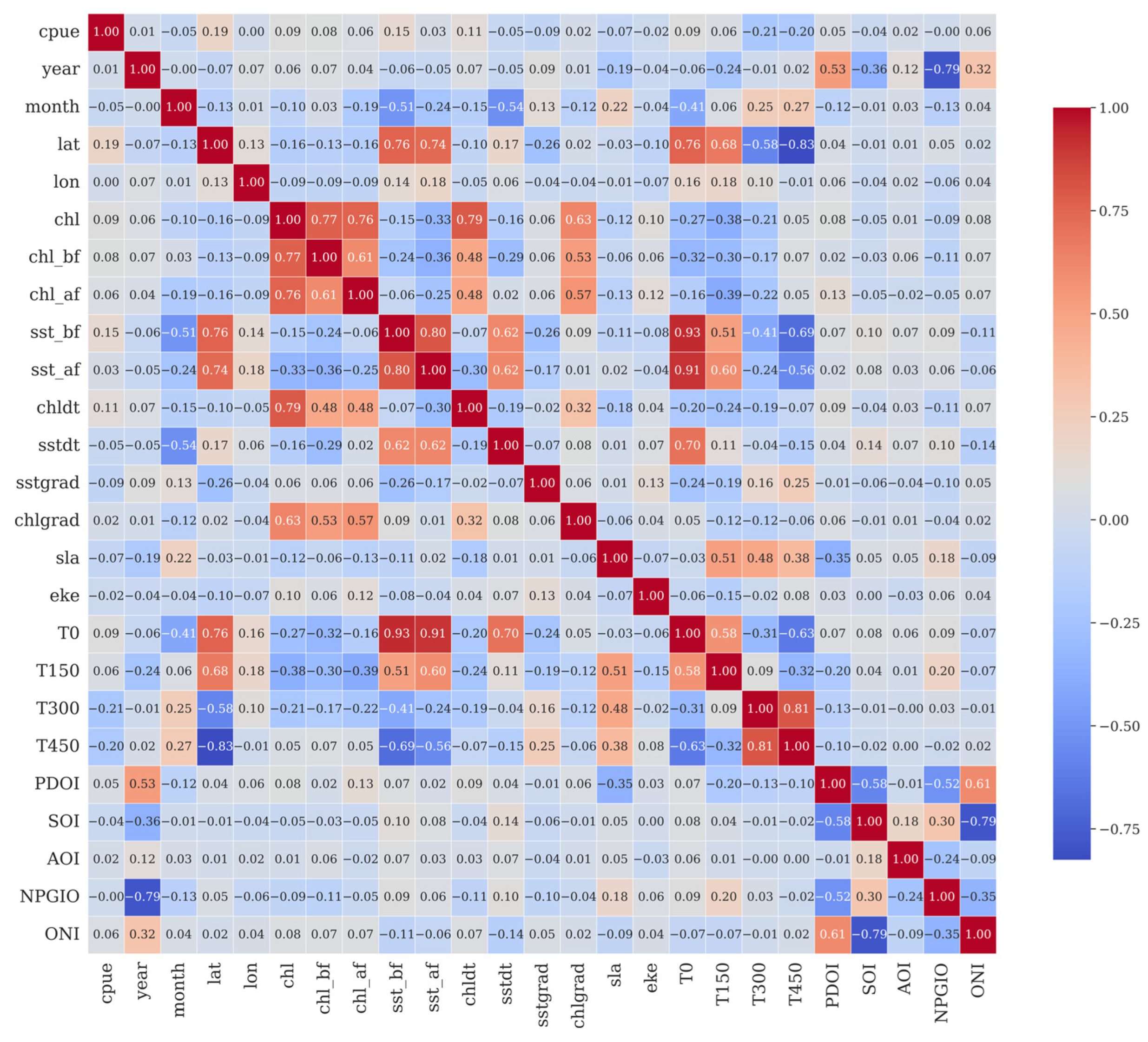 (2) Oceanographic environmental variables: Chlorophyll-a concentration (Chl-a), chlorophyll-a in the previous month (Chl_bf), chlorophyll-a in the following month (Chl_af); sea surface temperature in the previous month (SST_bf), and in the following month (SST_af); chlorophyll anomaly (Chldt), sea surface temperature anomaly (SSTdt), sea surface temperature gradient (SSTgrad), chlorophyll gradient (Chlgrad); sea level anomaly (SLA); eddy kinetic energy (EKE); and temperature at various depths including the surface (T0), 150 m (T150), 300 m (T300), and 450 m (T450).