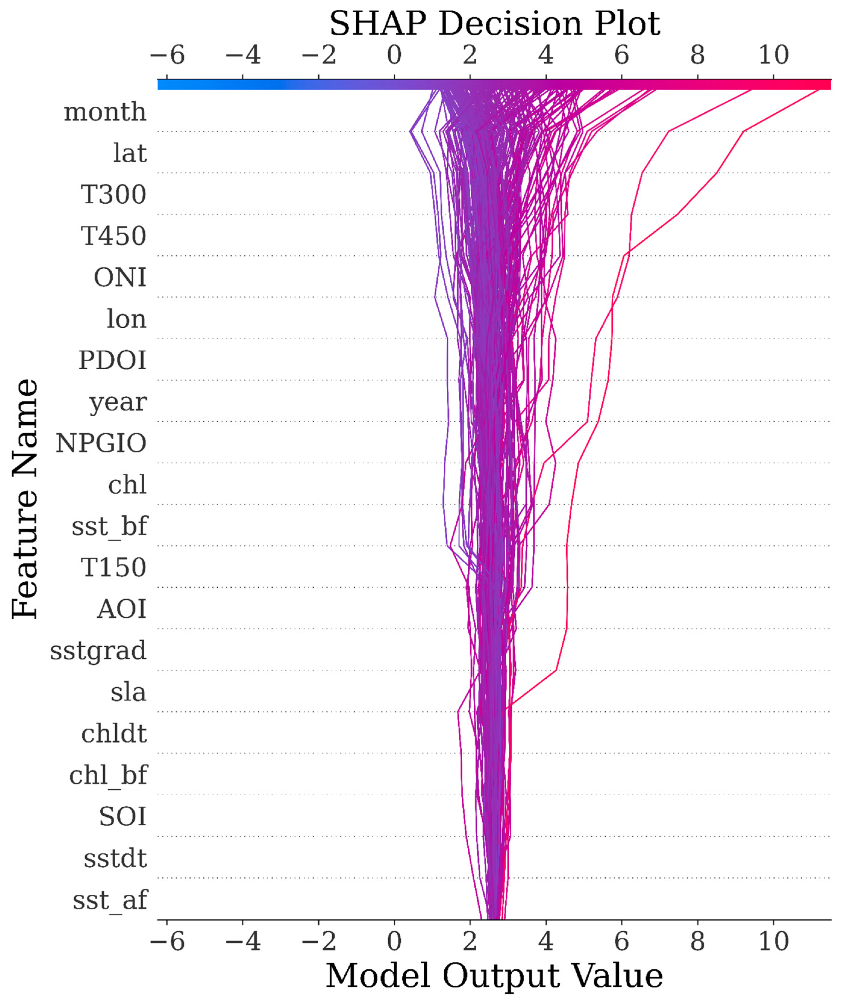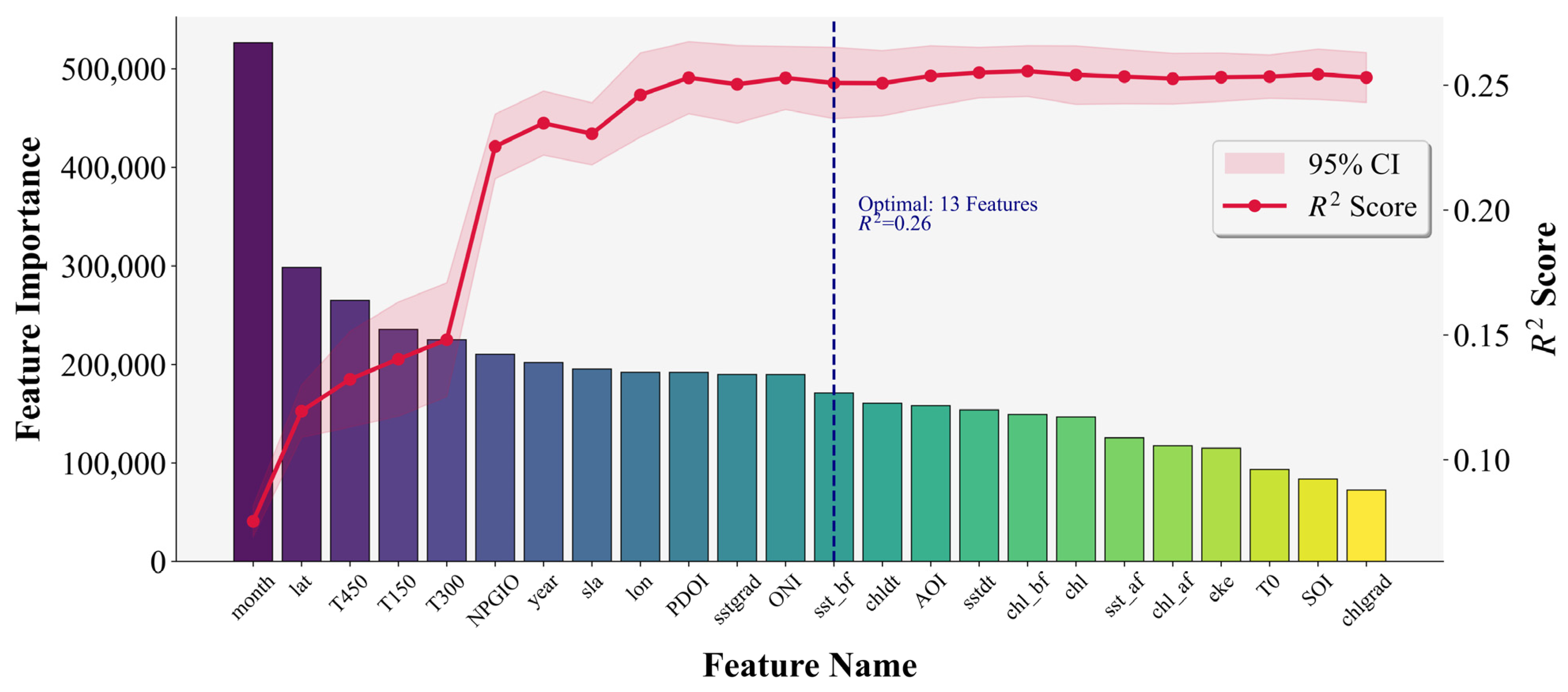 Catch per Unit Effort (CPUE) is a key indicator for assessing fishery resource abundance. CPUE refers to the amount of fish caught per standardized unit of fishing effort. For tuna longline fisheries, the fishing effort is typically measured in terms of the number of hooks, usually in thousands of hooks. It not only reflects the dynamic changes in the target population but also indirectly captures the regulatory effects of environmental factors on fishing efficiency [5]. Although CPUE has been widely applied in fisheries science and resource assessment, current research on feature selection faces two primary challenges. First, modeling approaches remain largely dominated by traditional linear regression techniques, with insufficient systematic evaluation of emerging machine learning algorithms such as ensemble learning. In particular, there is a lack of comparative studies on their abilities to capture nonlinear responses and interactions among features [6]; Second, the selection of predictor variables often relies on expert-driven or empirical screening, with limited use of model-based variable importance metrics. This may result in the underestimation of key drivers or the overestimation of redundant variables, ultimately compromising the ecological interpretability and predictive accuracy of the results [7].