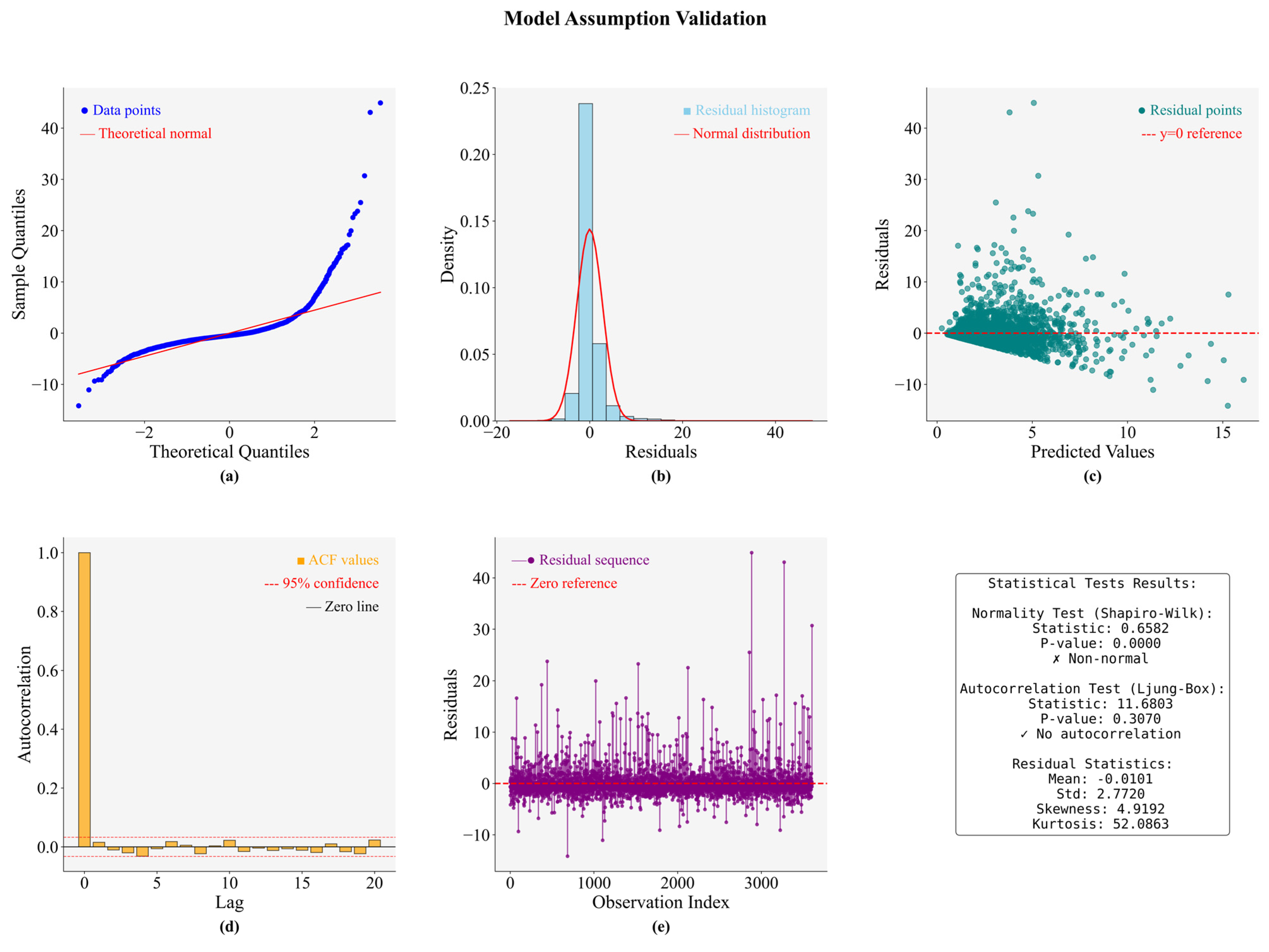 Figure 11. Model assumption validation results: (a) Q-Q plot for normality test; (b) Residual distribution histogram; (c) Residuals vs. predicted values scatter plot; (d) Autocorrelation function plot; (e) Residual sequence plot.