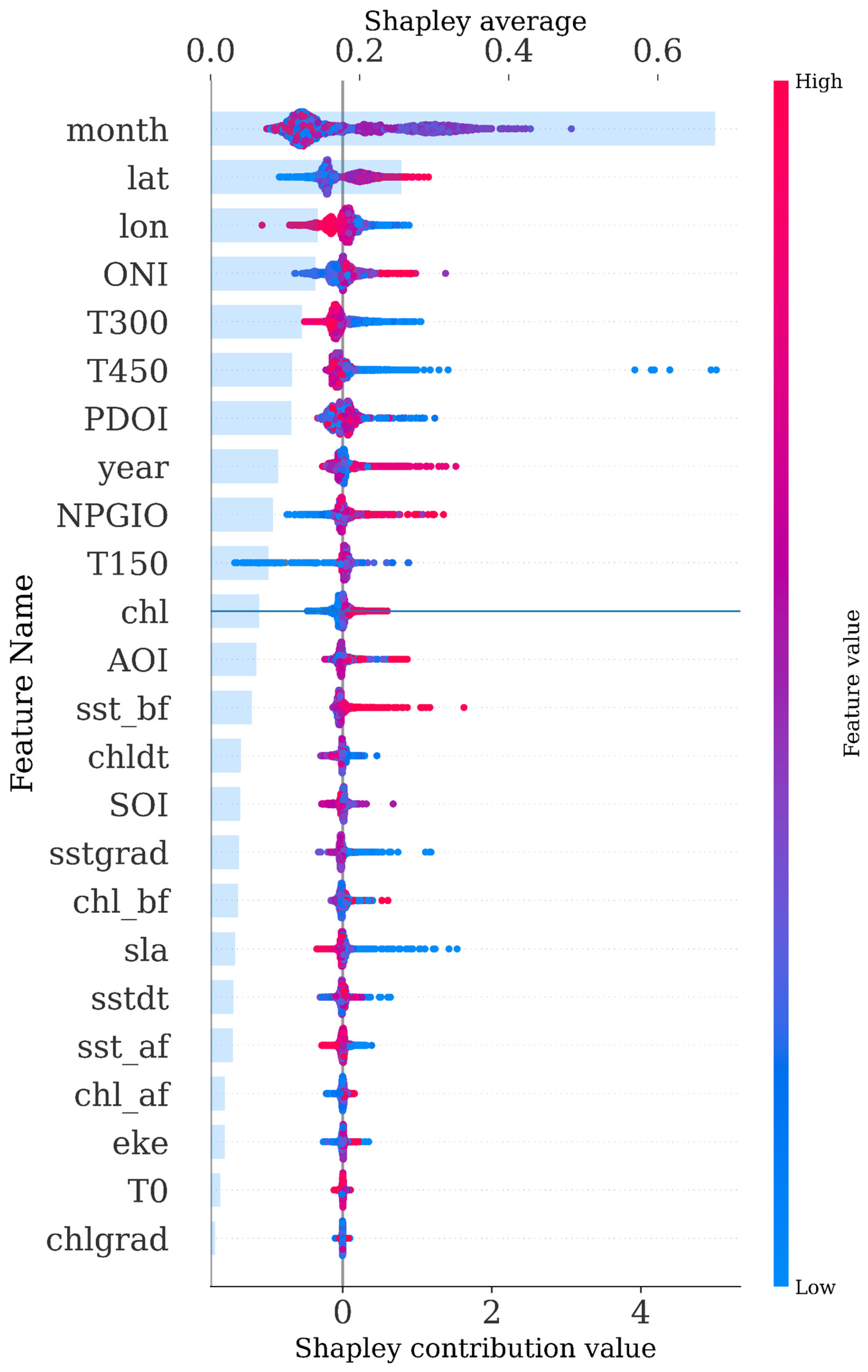 (4) SHAP (SHapley Additive exPlanations) Analysis Stage: To further enhance model interpretability and transparency, this study incorporated SHAP, a game-theoretic feature attribution method. Originating from Shapley values in cooperative game theory, SHAP aims to calculate the marginal contribution of each feature to the model output across all possible feature combinations, averaging these contributions to yield an accurate and fair representation of each variable’s influence [34]. It has been widely applied in ecological model interpretation, environmental risk assessment, and policy response analysis. Unlike LightGBM’s feature importance ranking, based on split frequency and split gain within the tree structure and reflecting structural feature contributions, SHAP values quantify each feature’s direct contribution to individual predictions. This facilitates the generation of more informative and interpretable feature importance rankings, offering insights into how each environmental factor influences the predicted CPUE values for Thunnus albacares [35].