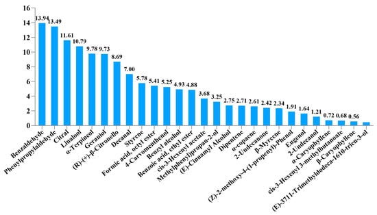 The analysis of the types and contents of volatiles from GC–MS was employed to identify compounds compared to those in the NIST14 spectral library. Quantitative analysis was performed using the normalized total ion current peak area. As shown in Table 1, volatile compounds released by blueberry flowers belong to six categories and comprise 32 components, including 10 alcohols, 5 aldehydes, 4 esters, 1 ketone, 3 aromatic compounds, and 9 olefins. Among these, linalool and styrene were the primary components, with relative amounts of 25.93% and 14.28%, respectively.