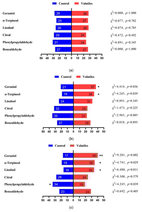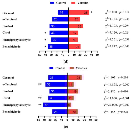 Behavioral responses of bumblebees to six volatiles. The corresponding volatile concentrations for (a–e) are 0.01 μg/μL, 0.1 μg/μL, 1 μg/μL, 10 μg/μL, and 100 μg/μL. The right side shows six volatile substances, while the left side shows the control (paraffin oil). Positive values on the right represent the attraction effect, and negative values on the left represent avoidance. The numbers in each bar chart represent the number of bumblebees that made the selection. In the chi-square test, * indicates a significant difference between volatile and control groups with p < 0.05, ** indicates a significant difference between the two with p < 0.01.