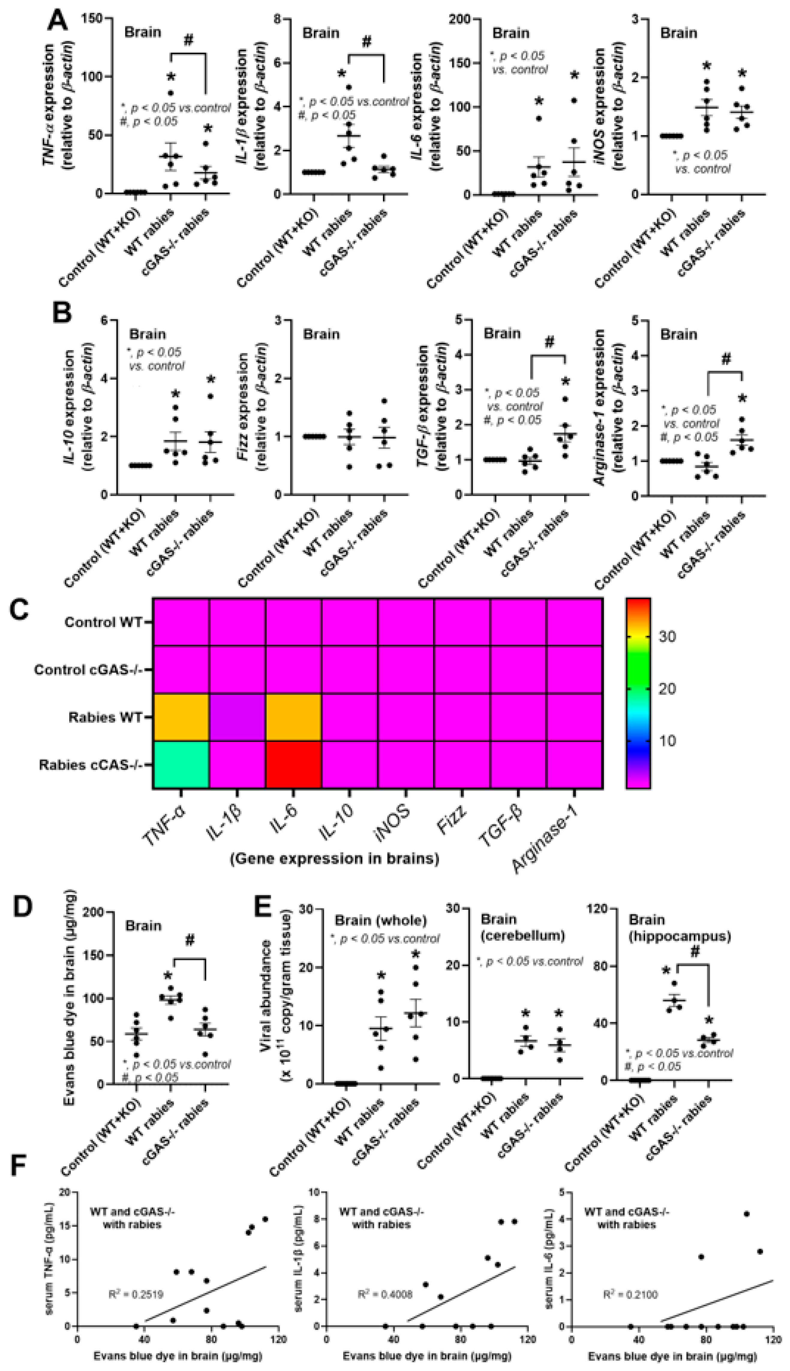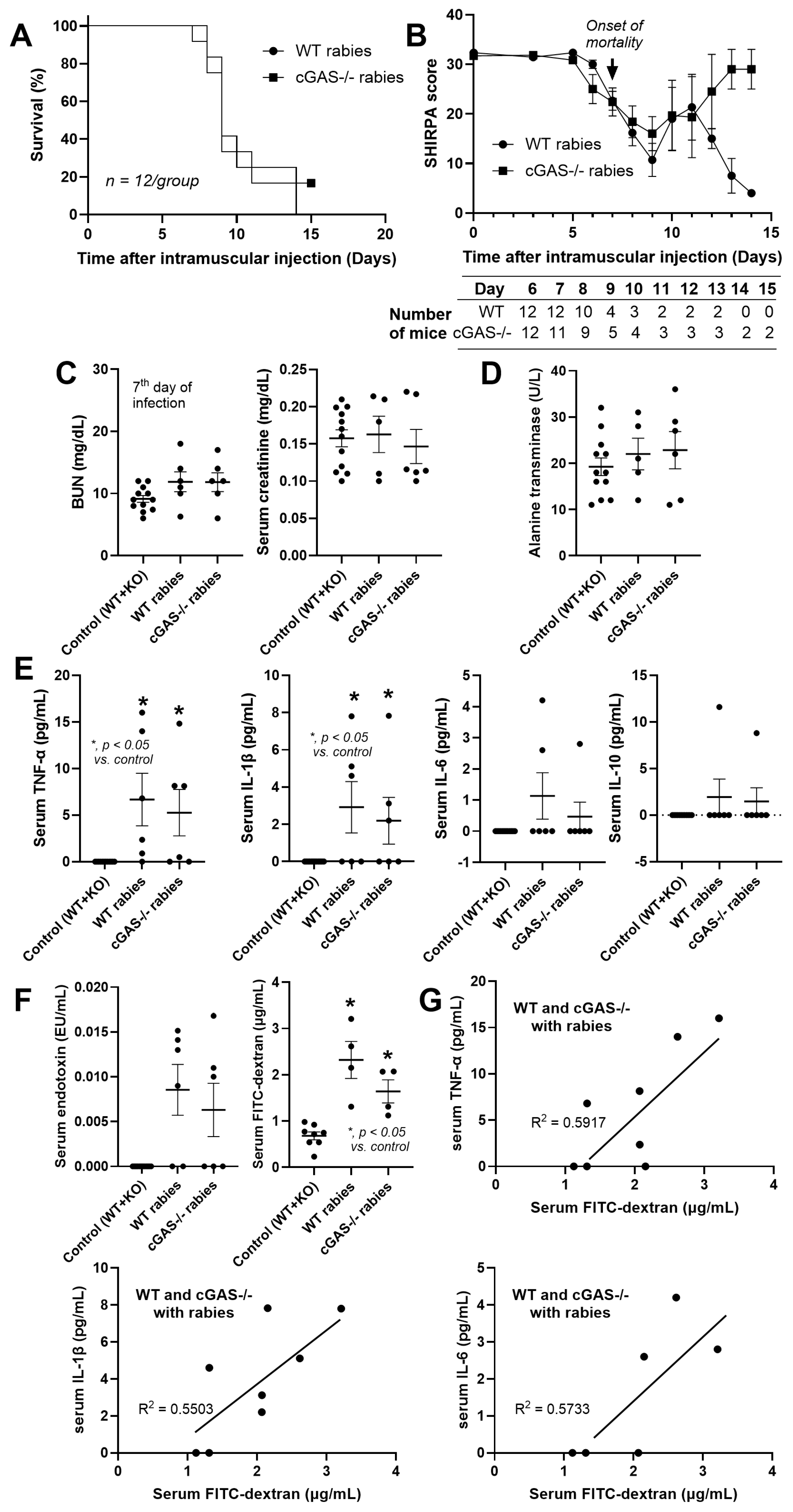 APA StyleAreekul, P., Bhunyakarnjanarat, T., Suebnuson, S., Somsri, K., Trakultritrung, S., Taveethavornsawat, K., Tencomnao, T., Boonyasuppayakorn, S., & Leelahavanichkul, A. (2025). Less Severe Inflammation in Cyclic GMP–AMP Synthase (cGAS)-Deficient Mice with Rabies, Impact of Mitochondrial Injury, and Gut–Brain Axis. Biology, 14(11), 1583. https://doi.org/10.3390/biology14111583