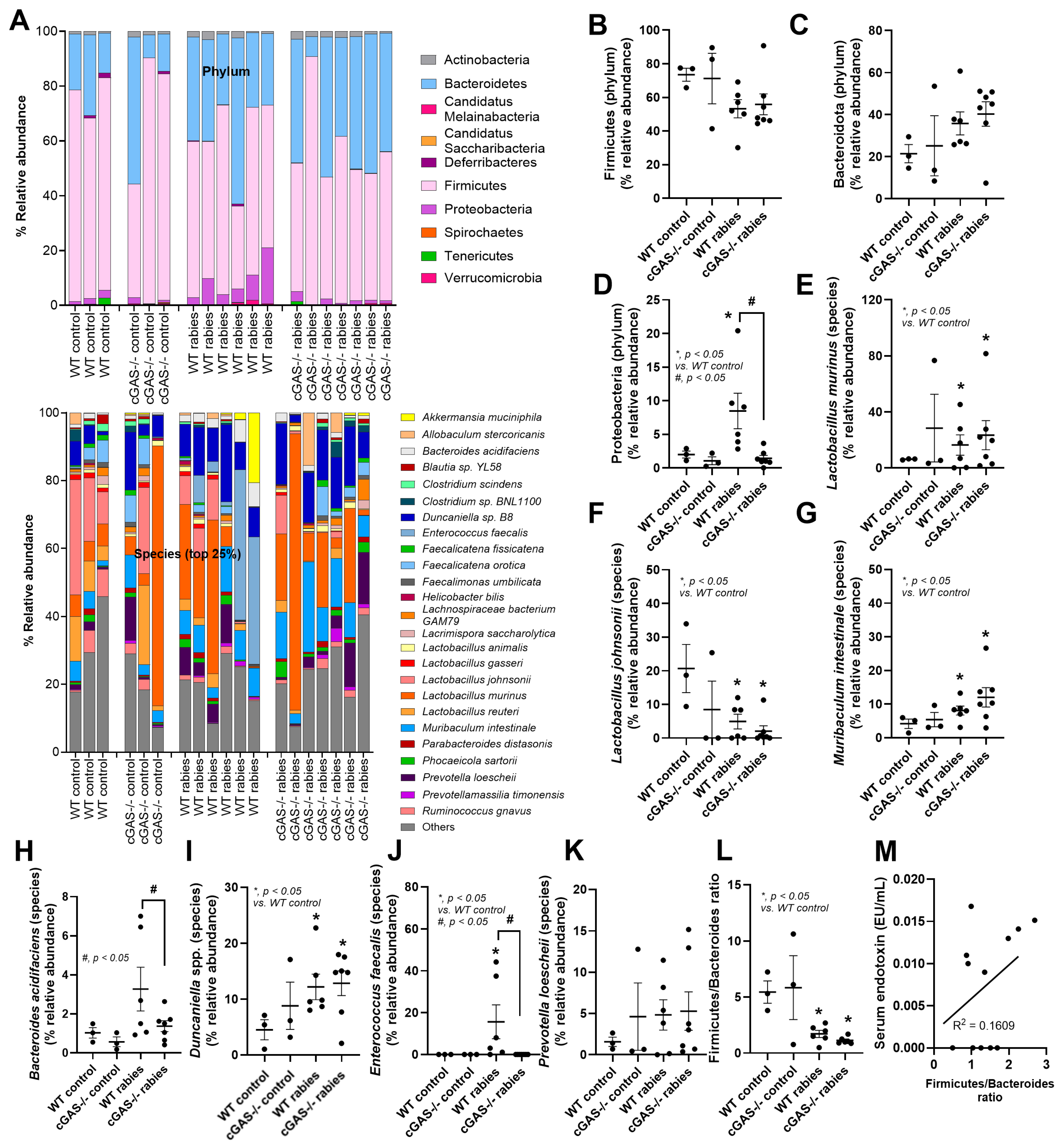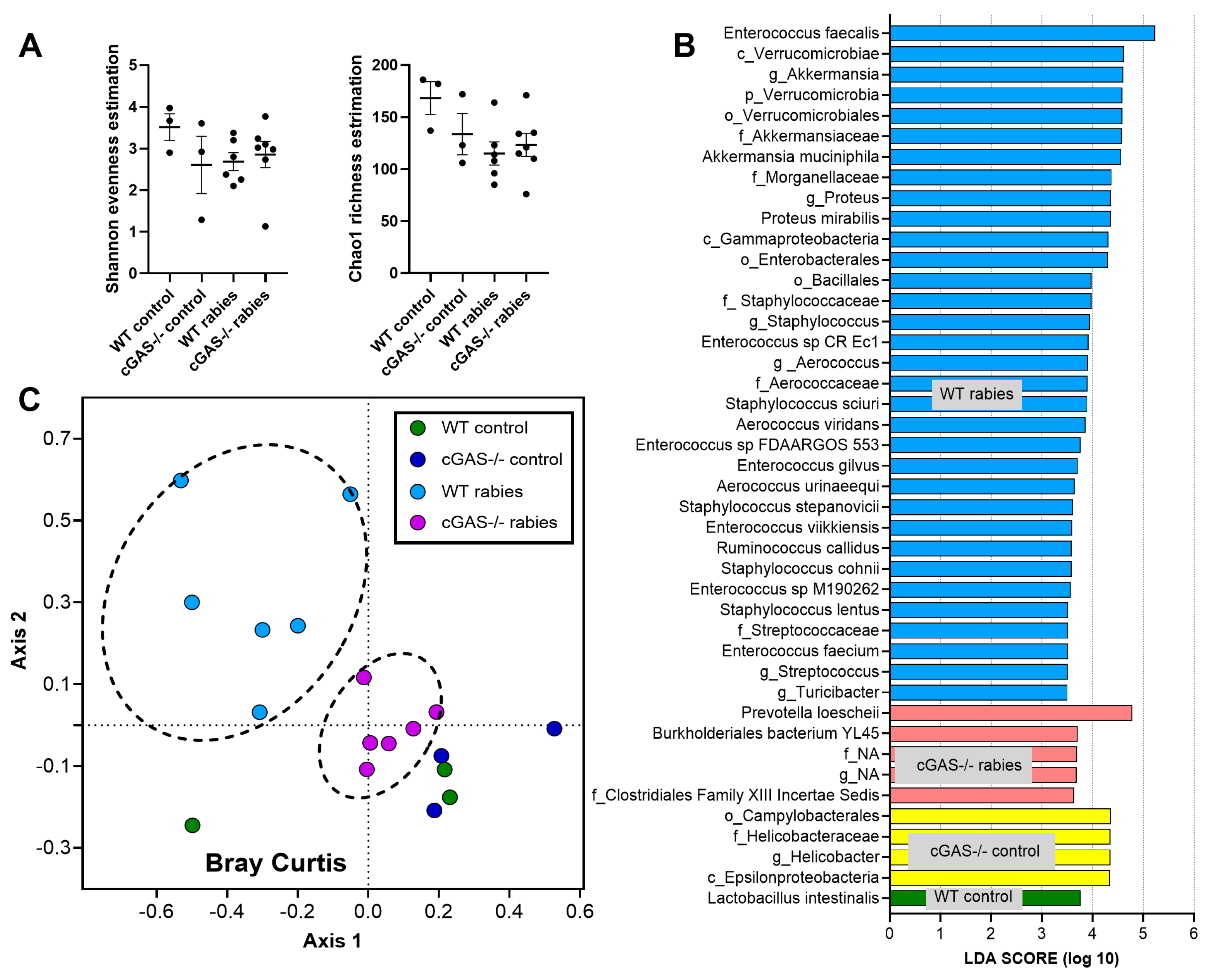 3.1. Less Severe Brain Inflammation and Gut Dysbiosis in Rabies-Infected cGAS-/- Mice