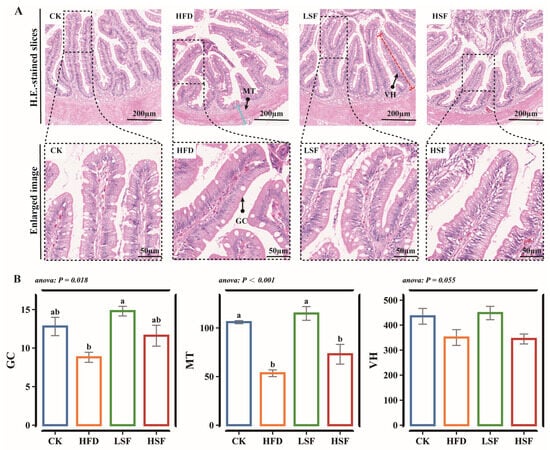 Intestinal histological morphology observation. (A) Intestinal H.E.-stained slices (×50). GC, goblet cell (a/root); MT (Blue line), muscle thickness (μm); VH (Red line), villi height (μm). (B) Intestinal histological morphology metrics. CK = diet containing 5.96% fat; HFD = diet containing 11.96% fat; LSF = HFD diet supplemented with 50 mg/kg soy isoflavones; HSF = HFD diet supplemented with 100 mg/kg soy isoflavones. Data were analyzed using one-way ANOVA following assumptions of variance homogeneity and normal distribution. Non-parametric datasets were subjected to Kruskal–Wallis ran-sum test followed by Dunn’s test for pairwise comparisons. Values (mean ± S.E.M, n = 3 individual fish) in the same row with different superscripts are significantly different (p < 0.05).