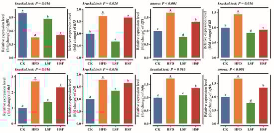 The high-fat diet significantly downregulated the mRNA expression of all tight junction genes (claudin12, occludin, zo1, and zo2) compared to the CON group (p < 0.01, Figure 2). The LSF group exhibited considerable upregulation of claudin12, occludin, zo1, and zo2 compared to the HFD group (p < 0.05). The HSF group also significantly rescued the expression of claudin12 and zo2 (p < 0.05).