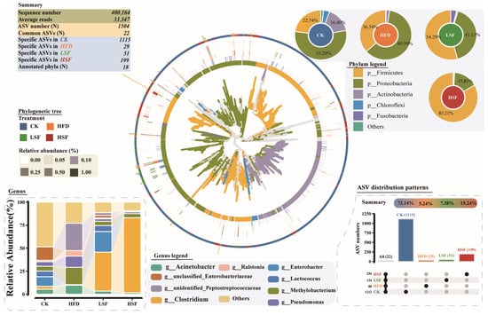 Microbial community structure in the gut of eel. Barcharts of relative abundance at the phylum level explain the distribution of dominant taxa. UpSet plot explains the number of unique and shared microbes in each group. Histogram of relative abundance at the genus level explains the distribution of dominant taxa. Phylogenetic tree was drawn using ggtree. The inner to outer frontal layout represents microbial evolutionary branches (colored by different phyla), microbial rings (colored by different phyla), and relative abundance heatmaps (colored by group). CK = diet containing 5.96% fat; HFD = diet containing 11.96% fat; LSF = HFD diet supplemented with 50 mg/kg soy isoflavones; HSF = HFD diet supplemented with 100 mg/kg soy isoflavones.