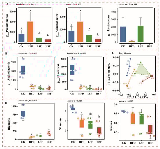 Dominant taxa, alpha and beta diversity of gut microbiota. (A,B) Significant changes in dominant phyla and genera; (C) beta diversity using PCoA analysis based on Bray–Curtis distance. (D) Boxplot of Richness index. CK = diet containing 5.96% fat; HFD = diet containing 11.96% fat; LSF = HFD diet supplemented with 50 mg/kg soy isoflavones; HSF = HFD diet supplemented with 100 mg/kg soy isoflavones. Data were analyzed using one-way ANOVA following assumptions of variance homogeneity and normal distribution. Non-parametric datasets were subjected to Kruskal–Wallis ran-sum test followed by Dunn’s test for pairwise comparisons. Values (mean ± S.E.M, n = 3 individual fish) in the same row with different superscripts are significantly different (p < 0.05).