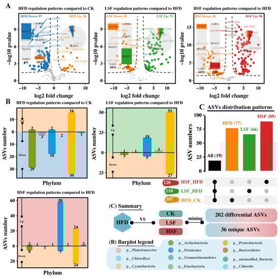 Further profiling of gut microbial profiles revealed that the gut of eels given the HFD diet exhibited 87 downregulated ASVs and 20 upregulated ASVs compared to the CK treatment. In contrast, eels on SIF-supplemented diets presented 75 (LSF) and 90 (HSF) upregulated ASVs, along with 35 (LSF) and 38 (HSF) downregulated ASVs (Figure 7A). The upregulated ASVs presented in the HFD group were mainly assigned to Proteobacteria, whereas downregulated ASVs were mostly classified into Actinobacteria, Firmicutes, and Proteobacteria as opposed to the pairwise comparison of the HFD and SIF-supplemented treatments (Figure 7B). Of note, a total of 202 differential ASVs were identified between the CK, and SIF-supplemented treatments compared to the HFD treatment (Figure 7C), in which 36 ASVs were substantially affected by dietary high fat or SIF supplementation.