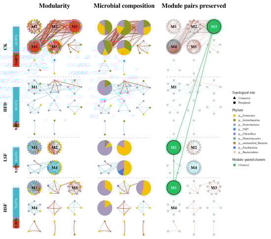 Modularity and ecological roles of molecular ecological network analysis. Specific modules of microbial networks were extracted, highlighting the abundance composition at the phyla level. Modules represent assemblages of microbes that can perform specific ecological functions. The modules of microbial network from each group were analyzed for similarity by Fisher’s test, and they were considered similar if the differences were found to be significant. Similar categories of modules were grouped into module clusters and colored accordingly. This allowed retention of microbial network modules and the potential ecological functions that could be performed under different treatments to be explored. CK = diet containing 5.96% fat; HFD = diet containing 11.96% fat; LSF = HFD diet supplemented with 50 mg/kg soy isoflavones; HSF = HFD diet supplemented with 100 mg/kg soy isoflavones.