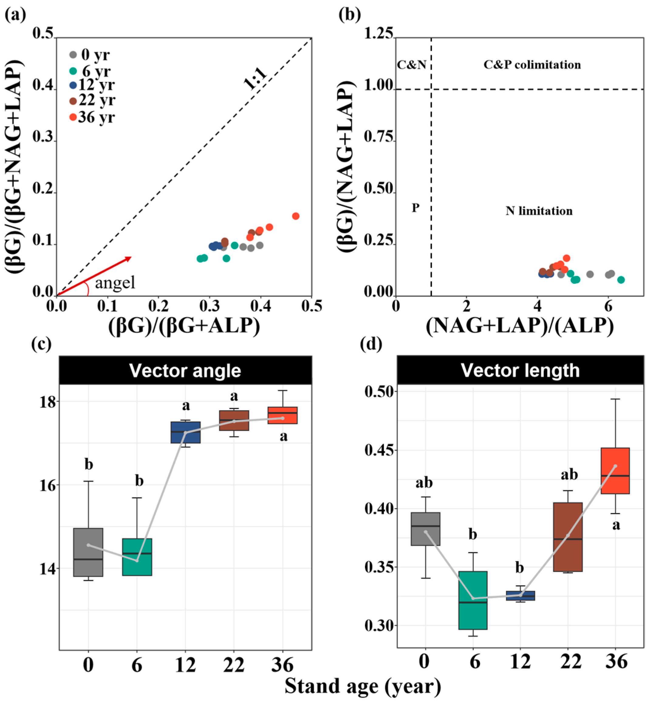 4.2. Effect of Afforestation on Soil Enzyme Activity and Stoichiometry with Afforestation Age