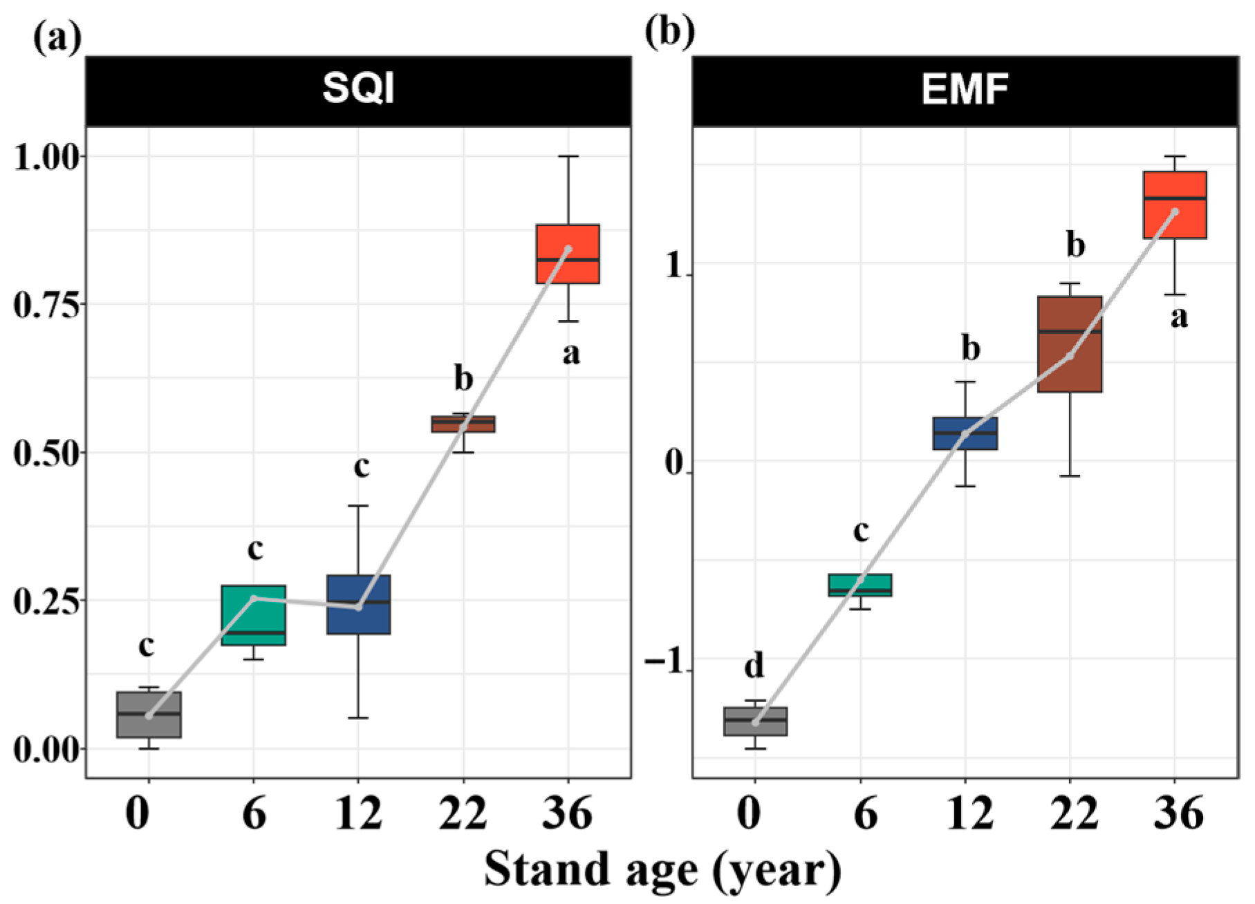3.3. Influence of Afforestation on SQI and EMF