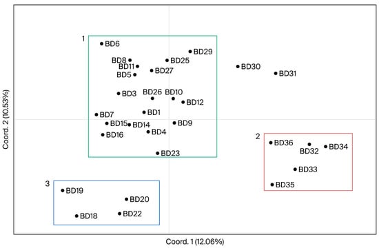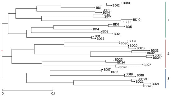 For the genebank accessions, the first two principal coordinates account for 10.53% and 12.06% of molecular variation, respectively, which discriminates 30 accessions in two dimensions. Although the samples are scattered in the graph, we can consider that the total accessions are grouped into three clusters (Figure 4). A total of 63% of the samples are found in the upper and central left parts of the graph, 37% of which includes Mozambican landraces [“UNK Malawe” (BD4), “Chissicuene 3” (BD9), “Nhacutze 3” (BD11), “Nhacutze 4” (BD15), “Nwamazamba” (BD23), “Chitandzana” (BD26) and “Xiadlaxakau” (BD29)] and 63% of which comprises breeding varieties [“Gloria” (BD1), “Lourdes” (BD5), “Namanga” (BD6), “Esther” (BD7), “Bela” (BD8) and “Irene” (BD27)], modern cultivars [“Naspot5” (BD3), “Jonathan” (BD12), “Maphuta” (BD14) and “Atacama” (BD25)] and two samples from Angola (BD10 and BD16). On the lower left side of the graph are the Mozambican breeding varieties “Erica” (BD19) and “Sumaia” (BD22), clustered with the Mozambican landrace “Canassumana” (BD20) and the modern cultivar “Resisto” (BD18) from the USA. On the lower right side of the graph, the Mozambican landraces “Nwamonguase” (BD32) and “Admarc” (BD36) are clustered with the breeding varieties “LO323” (BD33), “Tio Joe” (BD34) and “MGCL-01” (BD35). The landraces “Xiphone” (BD30—Mozambique) and “SPK004” (BD31—Kenya) in the upper right part of the graph do not cluster with any group.