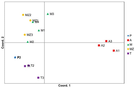 In order to assess the relationships among the accessions and how they cluster based on the SSR results, a principal coordinate analysis (PCoA) was performed. The samples from farmers’ fields are distributed into three groups (Figure 3). The Azorean landraces (A) are the most distant from all the other populations. Mozambican (MZ) and Madeiran (M) accessions are on the upper left side of the graph, while samples from Timor-Leste (T) and continental Portugal (P) are in the lower left part of the graph. All the samples, except the Azorean ones, have similar values at coordinate 1 but markedly different values at coordinate 2.