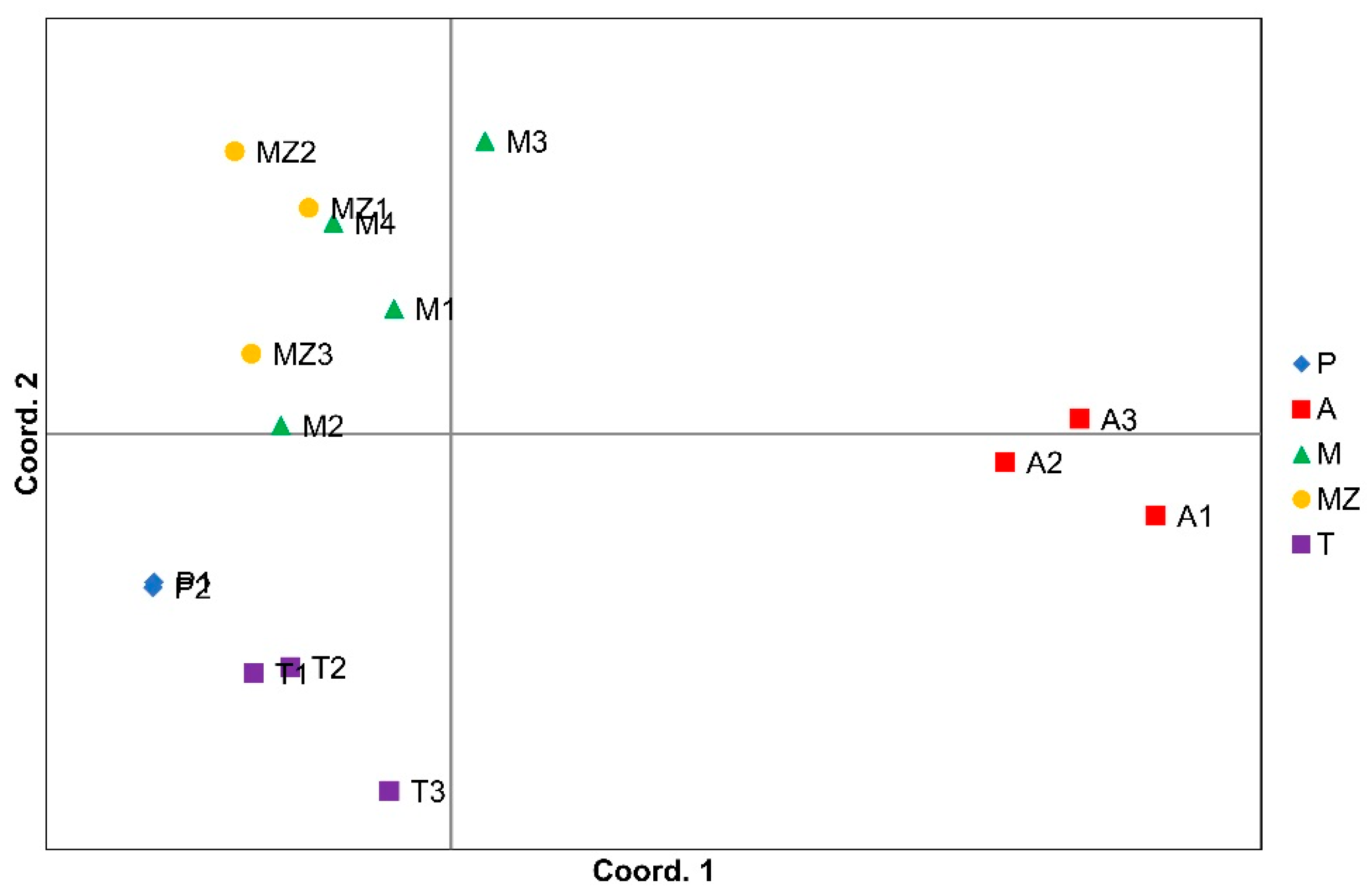 3.2. Phylogenetic Analysis and Principal Coordinate Analysis