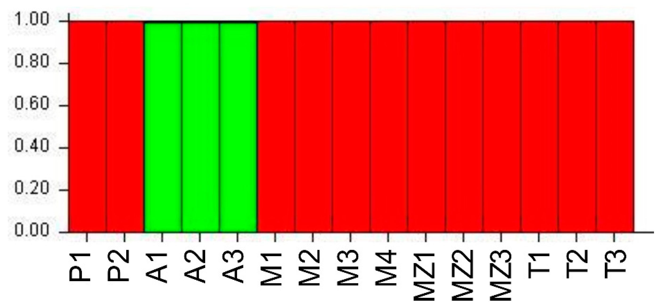 - Pritchard, J.K.; Stephens, M.; Donnelly, P. Inference of population structure using multilocus genotype data. Genetics 2000, 155, 945–959. [Google Scholar] [CrossRef]