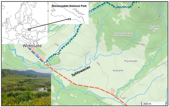 The field study was conducted in the valley of the Syhłowaciec stream within the Bieszczadzki National Park in the Eastern Carpathians, Poland (Figure 1). The reintroduction programme of beaver settlement in the Bieszczady Mountains began in 1992, and the main objective of reintroduction was to restore the species to its historical range, improve local hydrological conditions by increasing water retention, restore habitats, and increase biodiversity in the upper San River valley, which had been degraded as a result of inappropriate agricultural practices carried out before the national park was established [,,]. Between 1993 and 2003, 57 beaver families, a total number of 191 individuals, were reintroduced into the park area, preceded by a detailed selection of suitable locations []. The current population is estimated to be around 160 individuals [,]. This well-documented reintroduction followed extensive research [] and was supported by historical data, as well as a long-term presence of beavers in the protected area. These factors have enabled the observation of changes in the beaver population [,], in the landscape [,,], in the presence and appearance of plant species [,,,,], and in animal species [,,,].