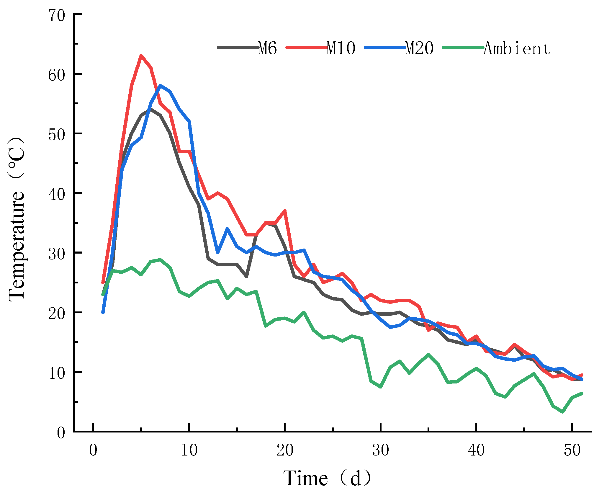 Temperature variations during the composting process are important indicators of composting progress and quality. Figure 3 shows the temperature changes for each treatment throughout the composting process. Based on these, the composting process can be divided into four stages: the initial stage, thermophilic phase, cooling phase, and maturation phase. The M6, M10, and M20 treatments entered the thermophilic phase on the 4th, 4th, and 6th days, with maximum temperatures reaching 54 °C, 63 °C, and 58 °C. For all treatments, the temperature remained above 50 °C for five consecutive days, meeting the thermal requirements for compost maturity.