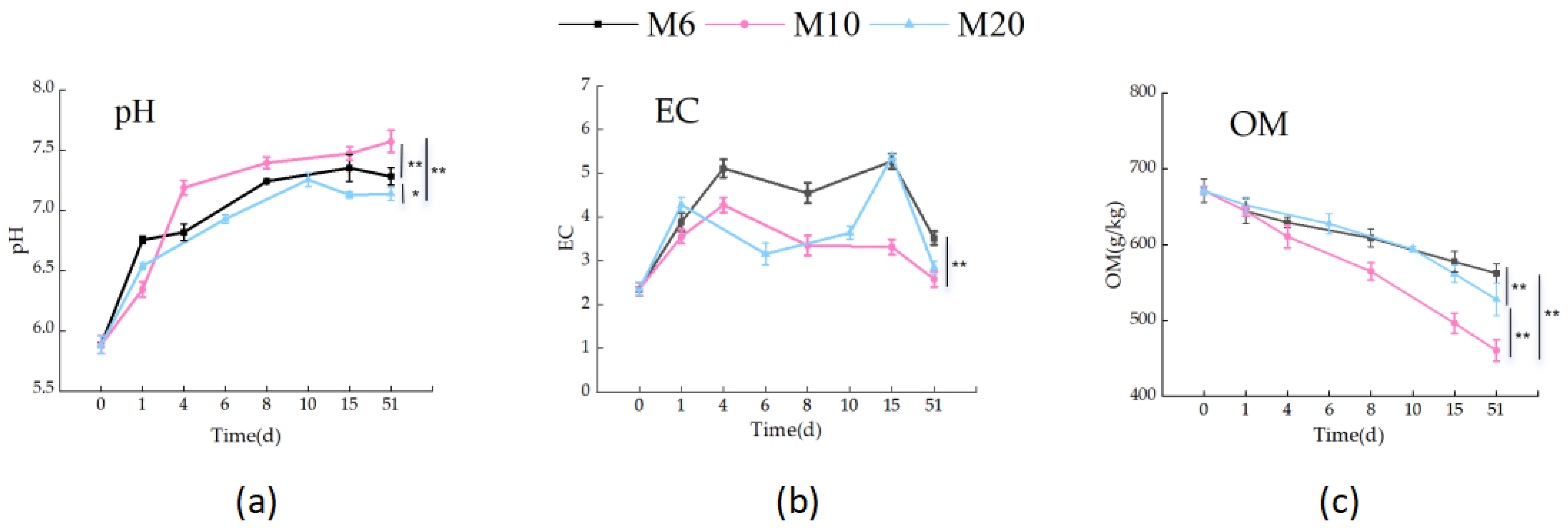 Figure 4. Changes in pH Value, EC Value, and Organic Matter (OM) in the three composting treatments: (a) changes in pH values during the composting process for the three treatments; (b) changes in EC values during the composting process for the three treatments; (c) Changes in organic matter during composting of the three treatments; * means p < 0.05, ** means p < 0.01. (The statistical significance assessment was conducted only for different treatment groups at the 51 day time point.).