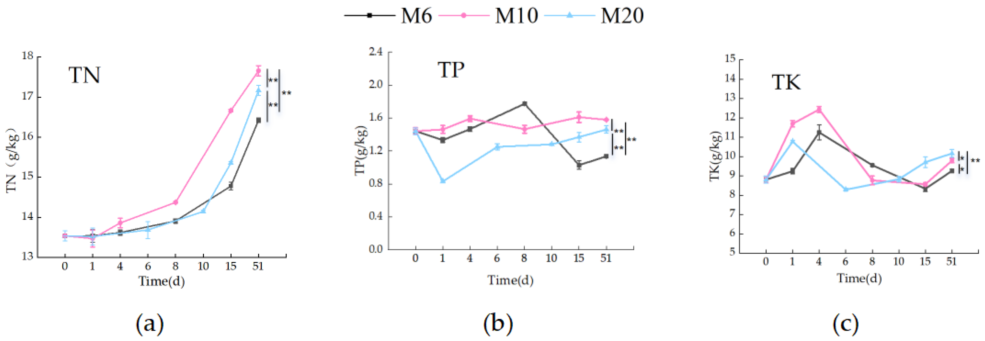 Figure 5. Changes in total nitrogen, phosphorus, and potassium in the three treatments: (a) changes in total nitrogen during the composting process for the three treatments; (b) changes in total phosphorus during the composting process for the three treatments; (c) changes in total potassium during the composting process for the three treatments; * means p < 0.05, ** means p < 0.01. (The statistical significance assessment was conducted only for different treatment groups at the 51 day time point.).