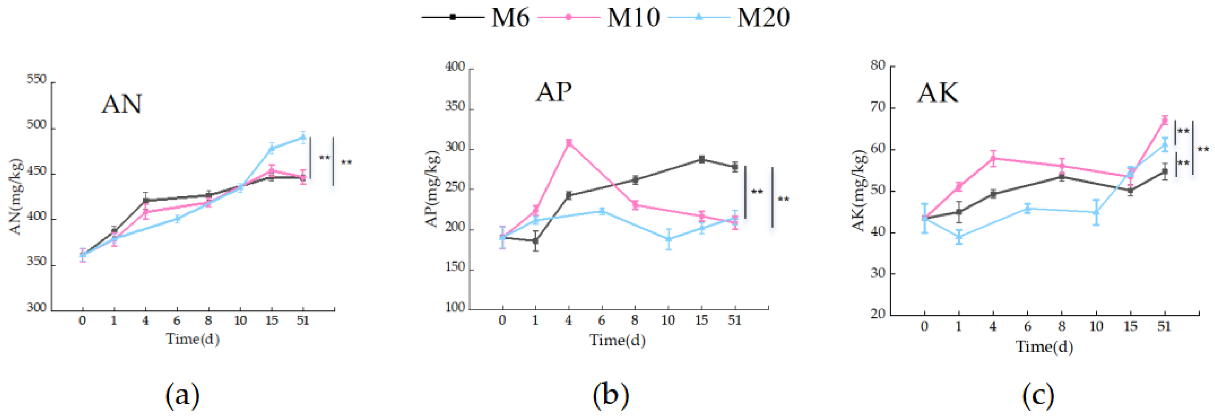 As shown in Figure 6a, the Available Nitrogen (AN) content during the corn cob aerobic composting process increased gradually across all treatments, with particle size significantly affecting the accumulation. At the start, AN content was approximately 350 mg/kg for all treatments. Over time, AN content rose steadily, with the M10 treatment showing the most significant increase, reaching approximately 450 mg/kg by day 51. In comparison, M6 and M20 treatments saw more moderate increases, with final values of 420 mg/kg and 430 mg/kg, respectively. The higher increase in AN in the M10 treatment can be attributed to the optimal particle size, which enhanced microbial activity and facilitated more efficient nitrogen mineralization and nitrification. Smaller particles provide a greater surface area for microbial colonization, thereby accelerating nitrogen cycling and improving nitrogen availability. While the M6 treatment also saw an increase in AN, the rise was slower, suggesting that smaller particle sizes might limit certain microbial processes despite enhancing others. On the other hand, the M20 treatment, with the largest particle size, exhibited the least increase in AN content, likely due to reduced microbial access to the organic material, which hindered nitrogen transformation [40]. These results are consistent with previous studies that highlight the importance of particle size in optimizing nitrogen release during composting, where smaller particles generally promote better microbial breakdown of organic matter and enhance nitrogen cycling, leading to higher AN content in the compost [41,42].