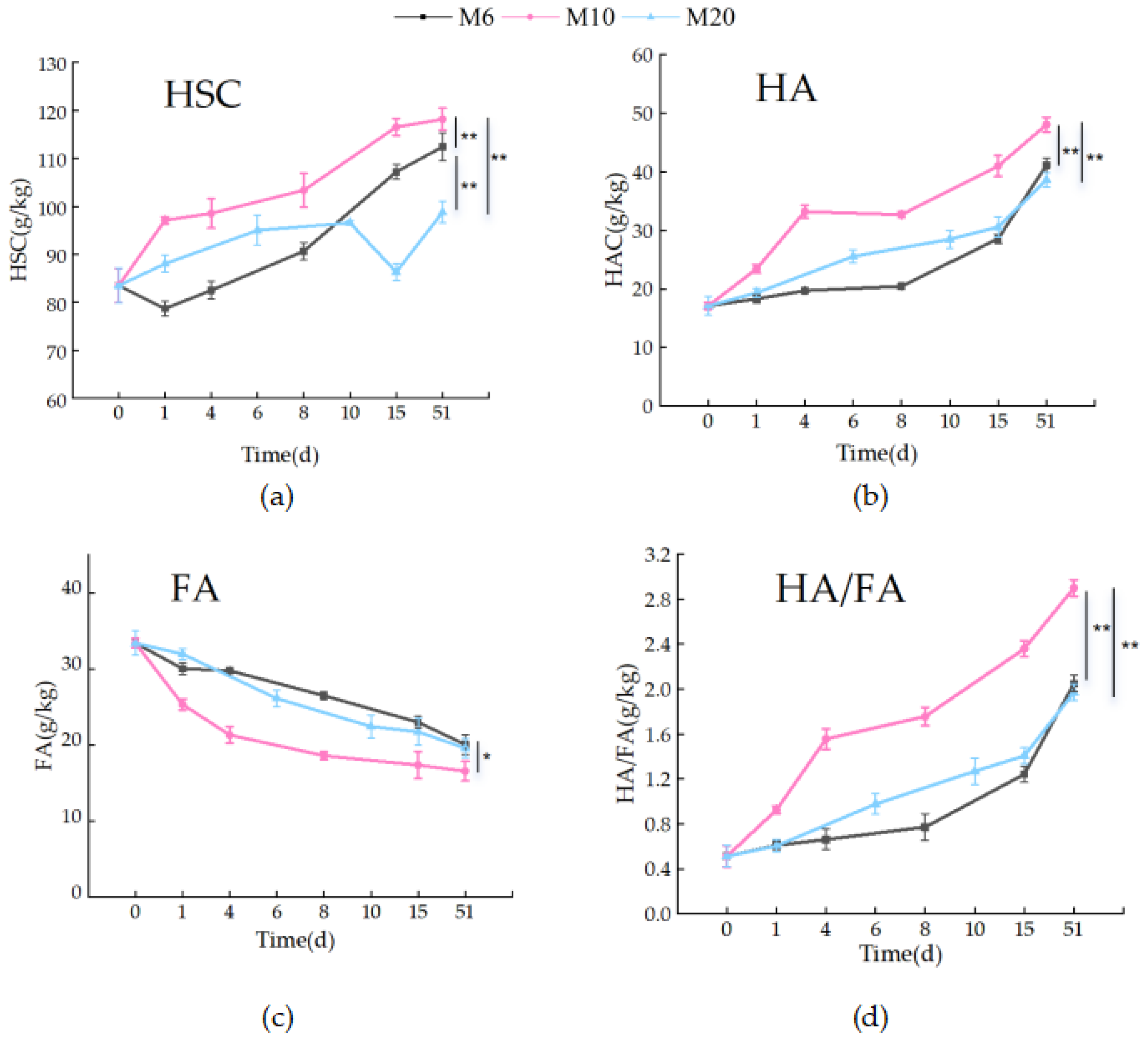 Throughout the composting process, a remarkable increase in HAC and a concurrent decrease in FAC were observed across all treatments. This trend indicates the continuous humification and maturation of organic matter. Specifically, the HAC content in the M10 treatment increased from an initial 23.44 g/kg to a final 48.30 g/kg, achieving the highest net gain and the final value among all treatments. The M6 treatment also exhibited a substantial increase in HAC, reaching 41.61 g/kg, while the M20 treatment yielded the lowest final HAC content of 38.16 g/kg.