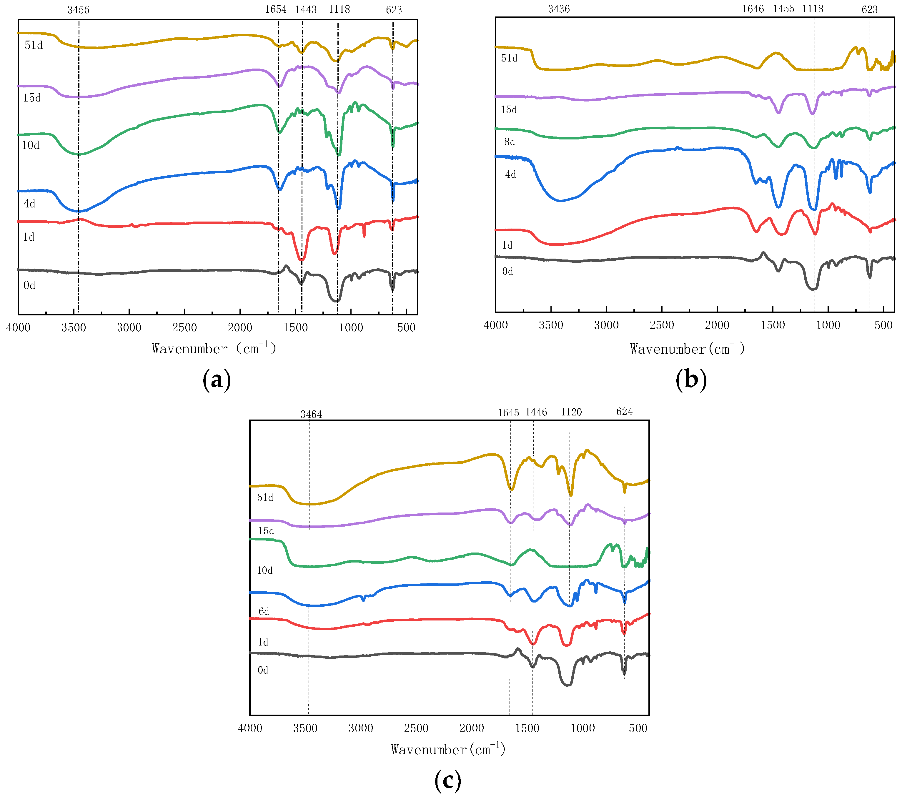 Figure 8. FTIR analysis of humic acids (HA) during composting under three treatments: (a) HA from the M6 treatment. (b) HA from the M10 treatment. (c) HA from the M20 treatment.