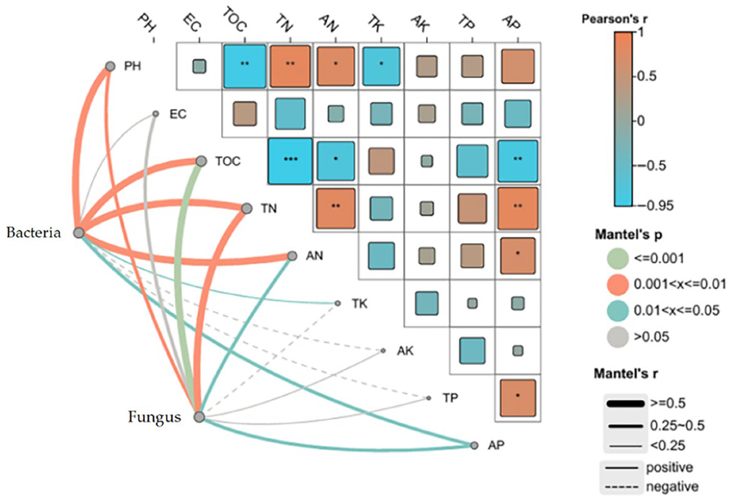 Figure 11. The Correlation between Microbial Community Structure and Composting Indicators. Note: This figure illustrates the Pearson correlation coefficients (r) and Mantel’s p values for the relationships between microbial community structures (Bacteria and Fungi) and various composting indicators, including pH, EC, total organic carbon (TOC), total nitrogen (TN), ammonium nitrogen (AN), total potassium (TK), available potassium (AK), available phosphorus (AP), and total phosphorus (TP) during the composting process. The size and color of the squares indicate the strength and direction of the correlation (positive or negative), with statistical significance marked by different Mantel’s p value ranges. * Means p < 0.05, ** means p < 0.01, and *** means p < 0.001. These results highlight the intricate interactions between microbial dynamics and nutrient cycling, which are influenced by particle size and composting conditions.