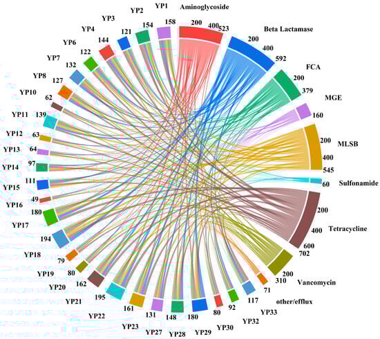 In this study, ARGs and MGEs were intended to be detected in 27 animal probiotic products with high microbial content, resulting in the identification of 241 ARGs and 7 MGEs (Table S3). The chord diagram vividly illustrates the diversity of ARGs and MGEs in the probiotic samples (Figure 3). Among them, the highest number of ARGs was detected in YP22, reaching 195 species, followed by YP18 with 194 detected ARGs. ARGs had the highest relative abundance in YP30, followed by YP11, and then YP33. The relative abundance in these three samples was nearly 10 times higher than in other samples.