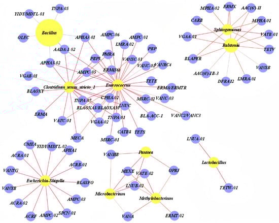 The co-occurrence network of ARGs and the bacterial community was visualized using Spearman correlation analysis to understand the relationship between them. The resulting co-occurrence network consisted of 10 nodes and 102 edges (Figure 6). Among the 10 bacterial communities, Enterococcus, Clostridium, Escherichia and Lactobacillus were extremely significant positive correlation with multiple ARGs, principally aminoglycosides, β-lactams, FCA and tetracyclines, particularly gene classes conferring resistance to β-lactams, aminoglycosides, MLSB and FCA (r > 0.80, p < 0.001). On the other hand, Enterococcus showed an extremely significant positive correlation with two MGEs (TNPA-07 and TNPA-01), but no obvious correlation with other ARGs. Furthermore, Bacillus showed a weak correlation with three aminoglycosides (AADA-1-02, APHA3-01 and APHA3-02), and we also observed that Bacillus had the highest abundance in the bacterial community but didn’t show a significant correlation with any ARGs.