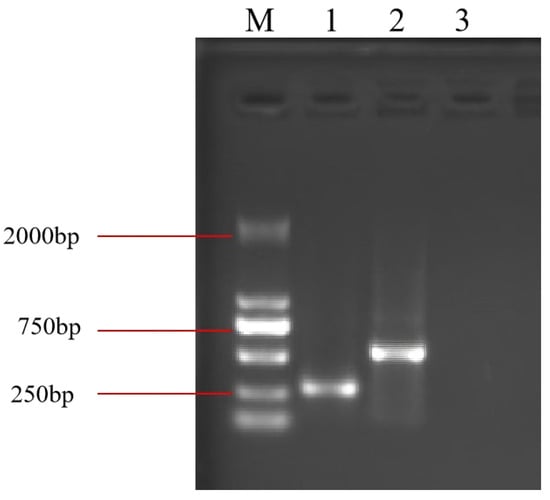 RNA extracted from induced E. coli harboring the empty plasmid or from the two recombinant plasmids. M: DL 2000 marker; 1: Bc-triangle; 2: Bc-dsRNA; 3: pET-28a.