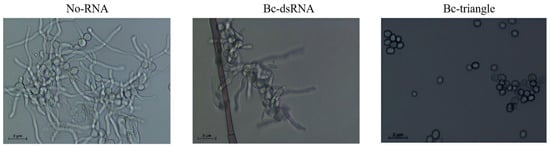Conidial suspensions of B. cinerea (1 × 106 spores/mL) were incubated with either No-RNA (water was used as the negative control), Bc-dsRNA, or Bc-triangle (final concentration 100 ng/μL). After 24 h incubation at 26 °C on a glass slide, spore germination was observed under a microscope.