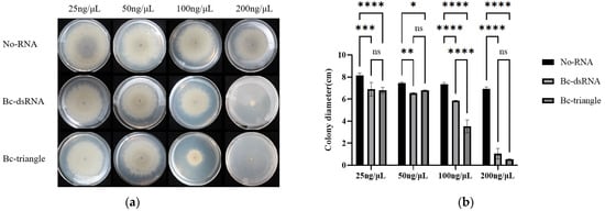 Following the sterilization of PDA (121 °C, 15 min), the medium should be cooled to 50–60 °C, and the Bc-triangle and Bc-dsRNA should be incorporated into the PDA medium. In order to achieve the desired concentrations, 7.5 mL of RNA solution was added to each 150 mL of PDA medium, resulting in final working concentrations of 25, 50, 100, and 200 ng/μL. The control group, which did not receive any treatment, received an equal volume of ddH2O. Mycelial plugs (5 mm) from actively growing B. cinerea cultures were placed at the center of each plate and incubated at 26 °C for 5 days. Colony diameters were measured, and inhibition rates were calculated relative to the No-RNA controls.