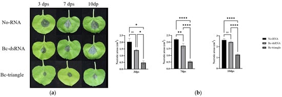 Four-week-old Nicotiana benthamiana plants were sprayed with 5 mL of either sterile water, Bc-dsRNA, or Bc-triangle (200 ng/μL). At 3, 7, and 10 days post spraying (dps), individual leaves were inoculated with B. cinerea mycelial plugs (1 per leaf). Disease progression was assessed after 3 days by measuring necrotic lesion areas by ImageJ 1.53k (NIH, Bethesda, MD, USA). Data were analyzed from three biological replicates.