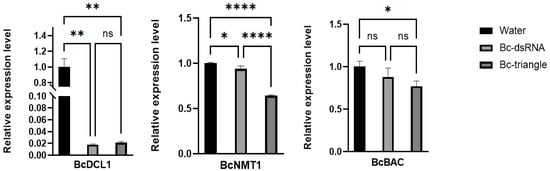 Expression levels of two target genes on B. cinerea treated by Bc-dsRNA and Bc-triangle. The Actin gene of B. cinerea was used as the internal control. The results are expressed as the means ± SEM of three biological replicates. Asterisk indicates the statistically significant differences according to one-way analysis of variance with Tukey test (ns: p > 0.05; *: p < 0.05; **: p < 0.01; ****: p < 0.0001.