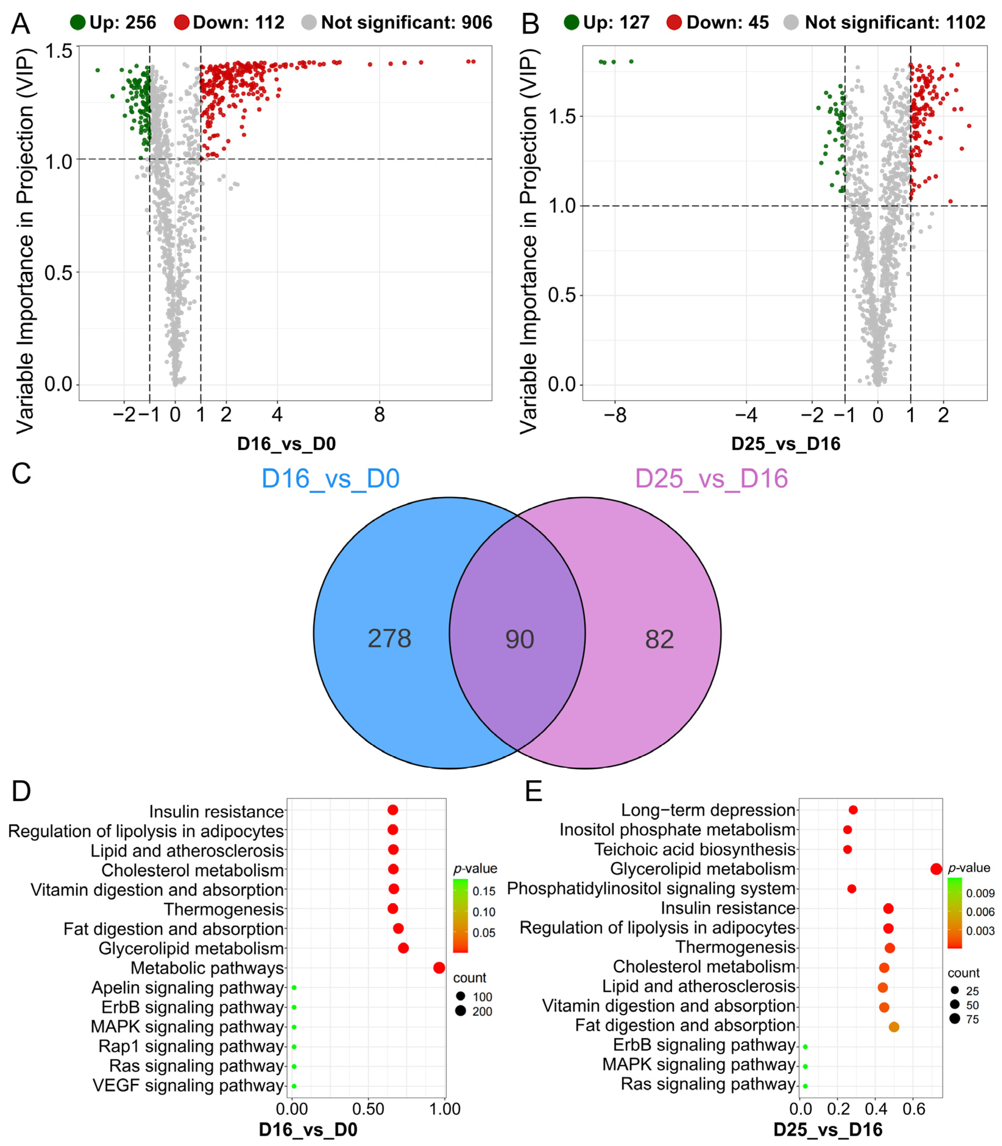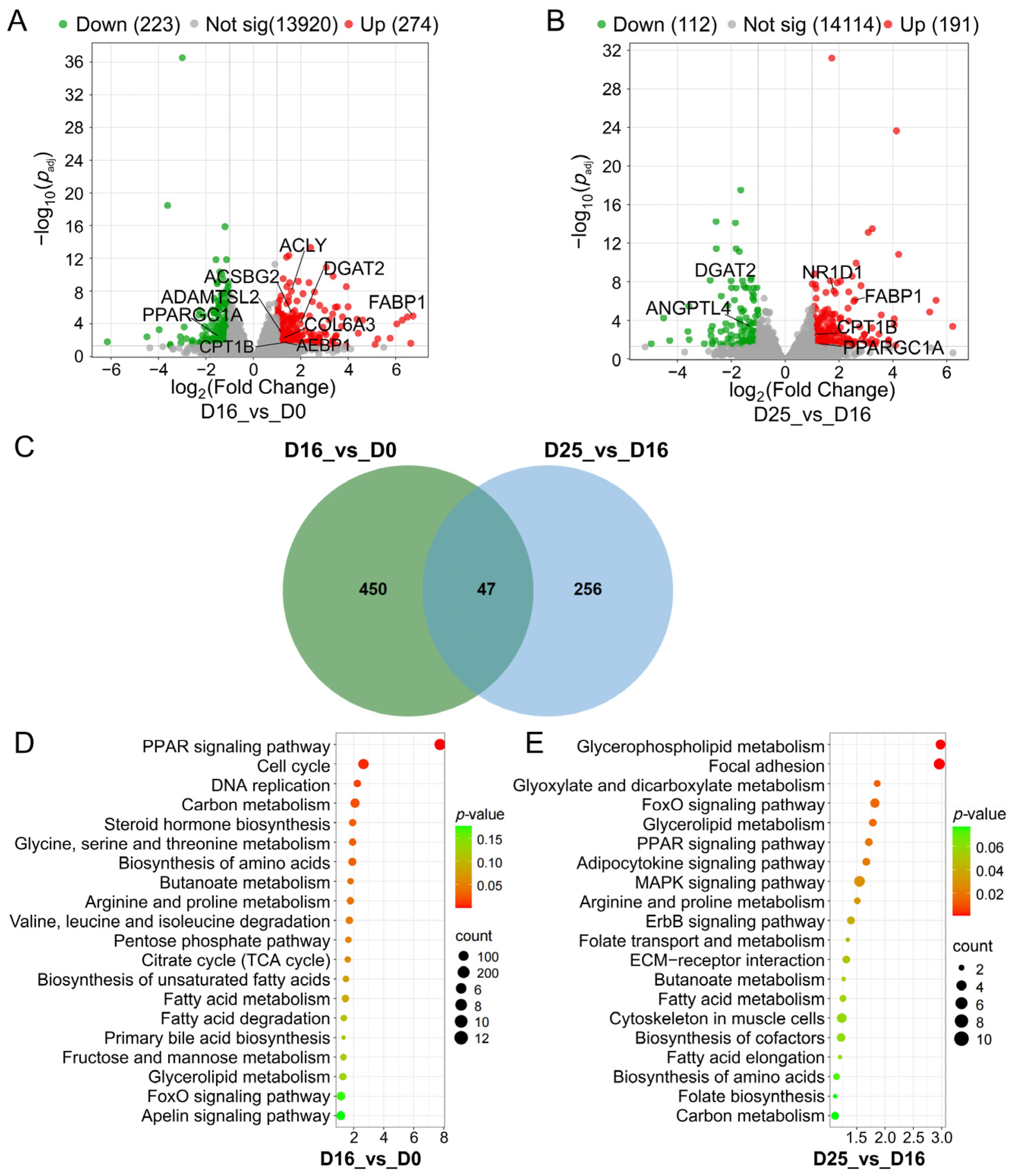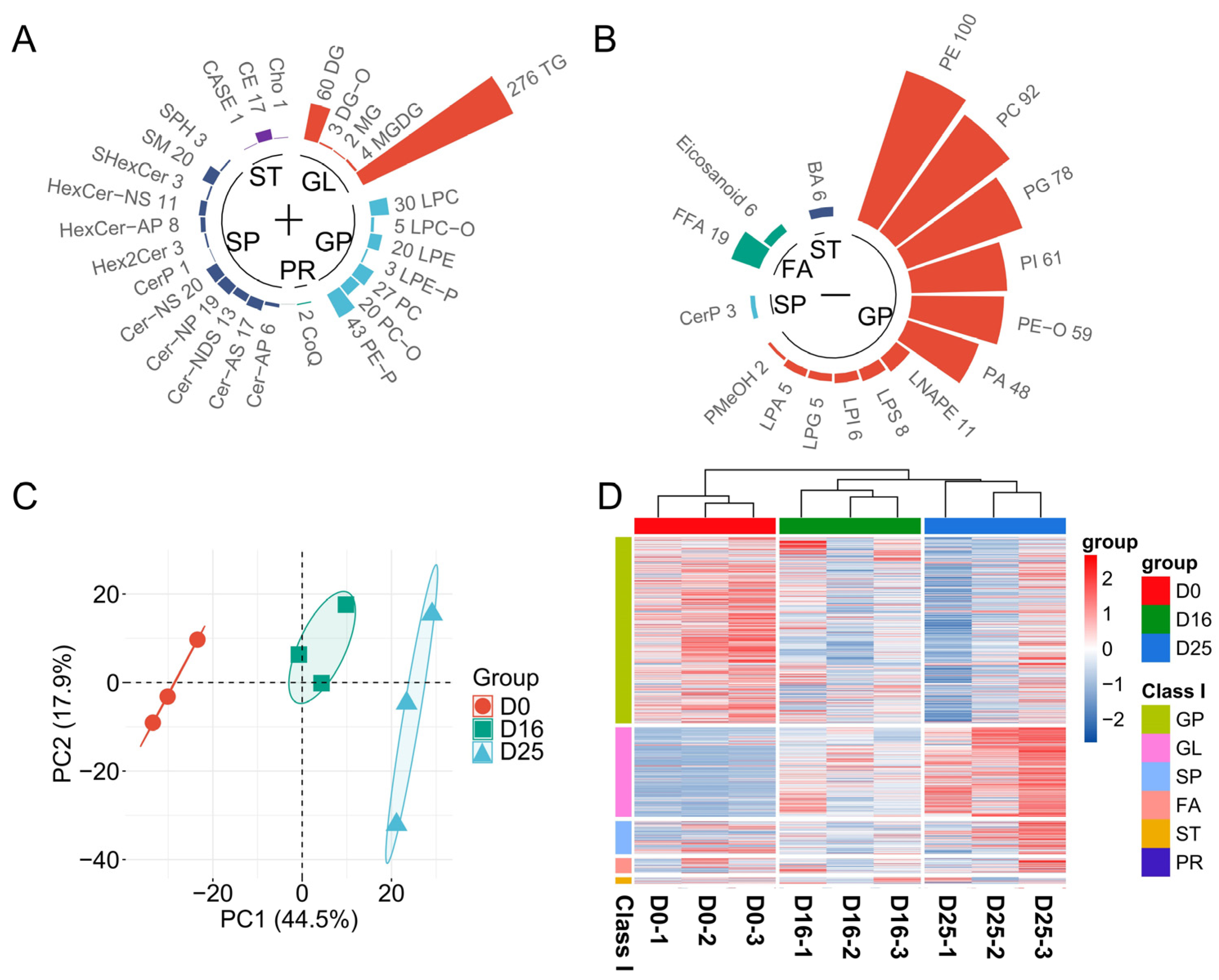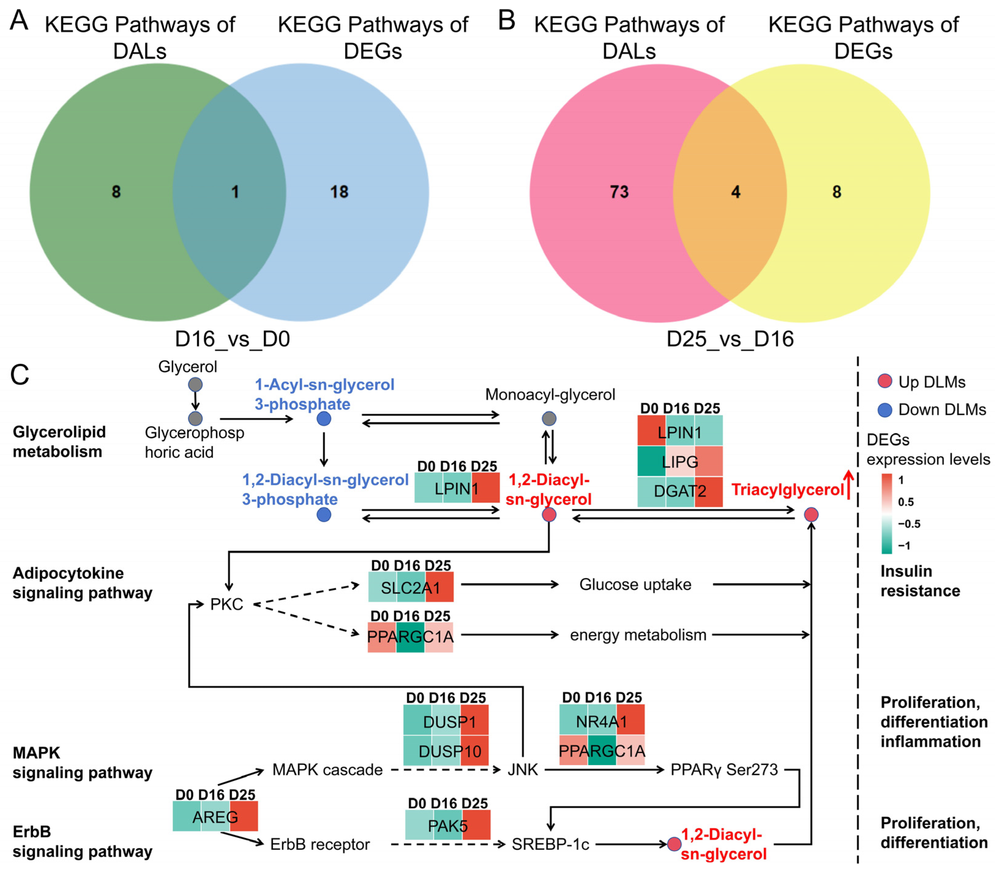 | D25 vs. D16 | ko00561 | Glycerolipid metabolism | DGAT2, DGKI, LPIN1, LPIN2 | 1-Acyl-sn-glycerol3-phosphate, 1,2-Diacyl-sn-glycerol (Diglyceride), Triacylglycerol |