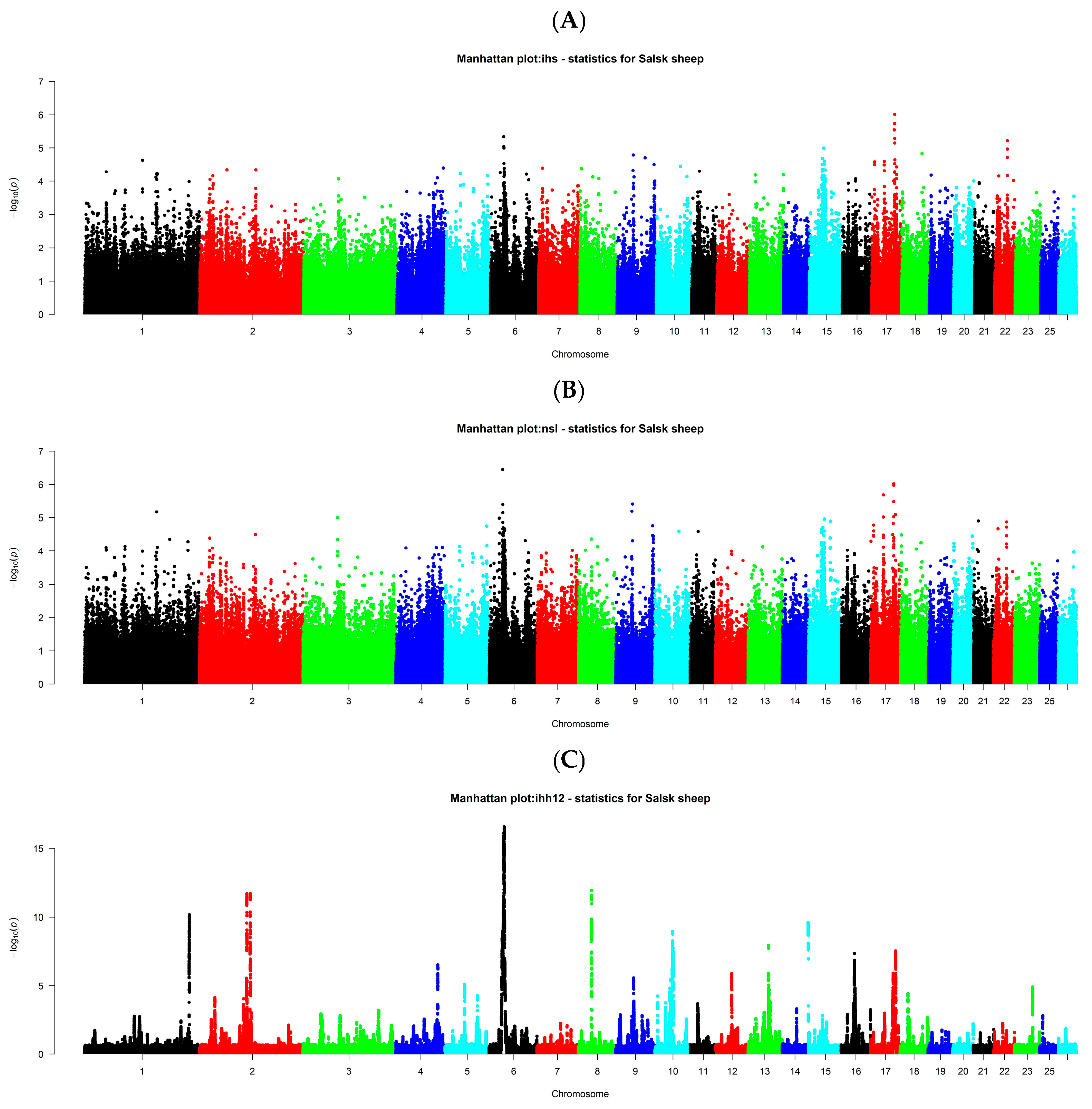 3.4. Intra-Population Selection Signatures (iHS, nSL, iHH12)