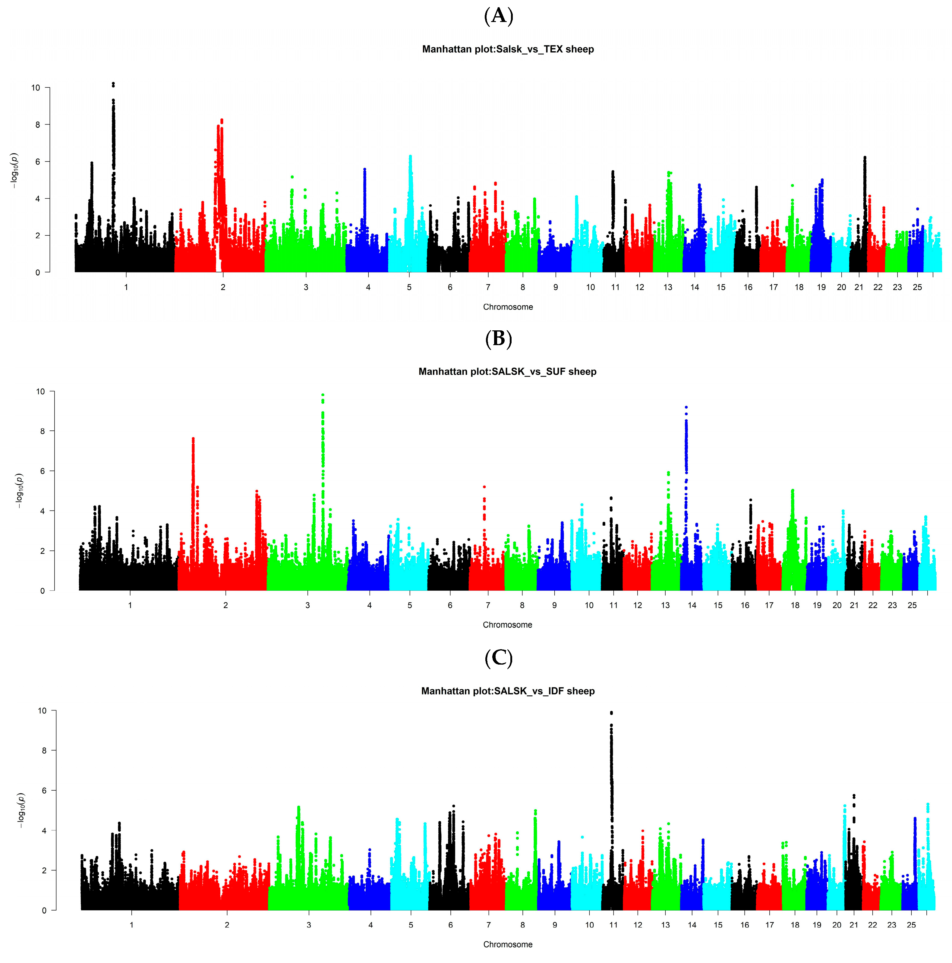 - Li, T.; Xing, F.; Zhang, N.; Chen, J.; Zhang, Y.; Yang, H.; Peng, S.; Ma, R.; Liu, Q.; Gan, S.; et al. Genome-Wide Association Analysis of Growth Traits in Hu Sheep. Gene 2024, 15, 1637. [Google Scholar] [CrossRef]