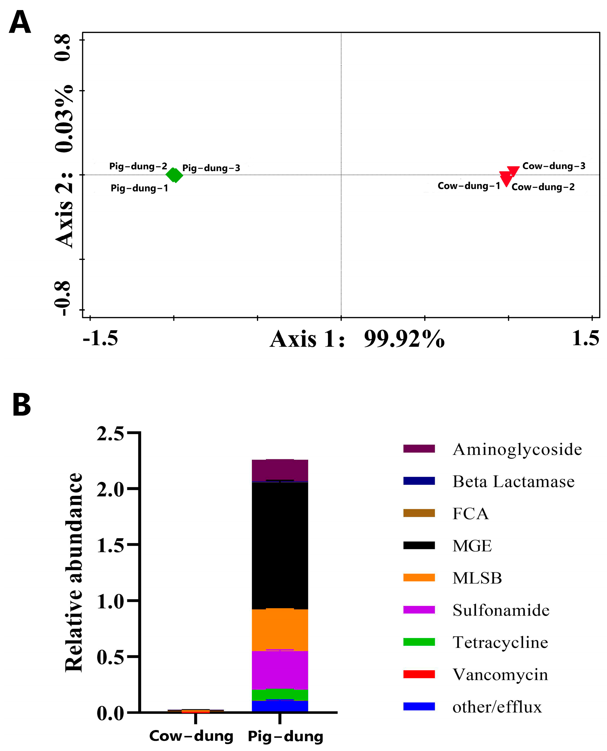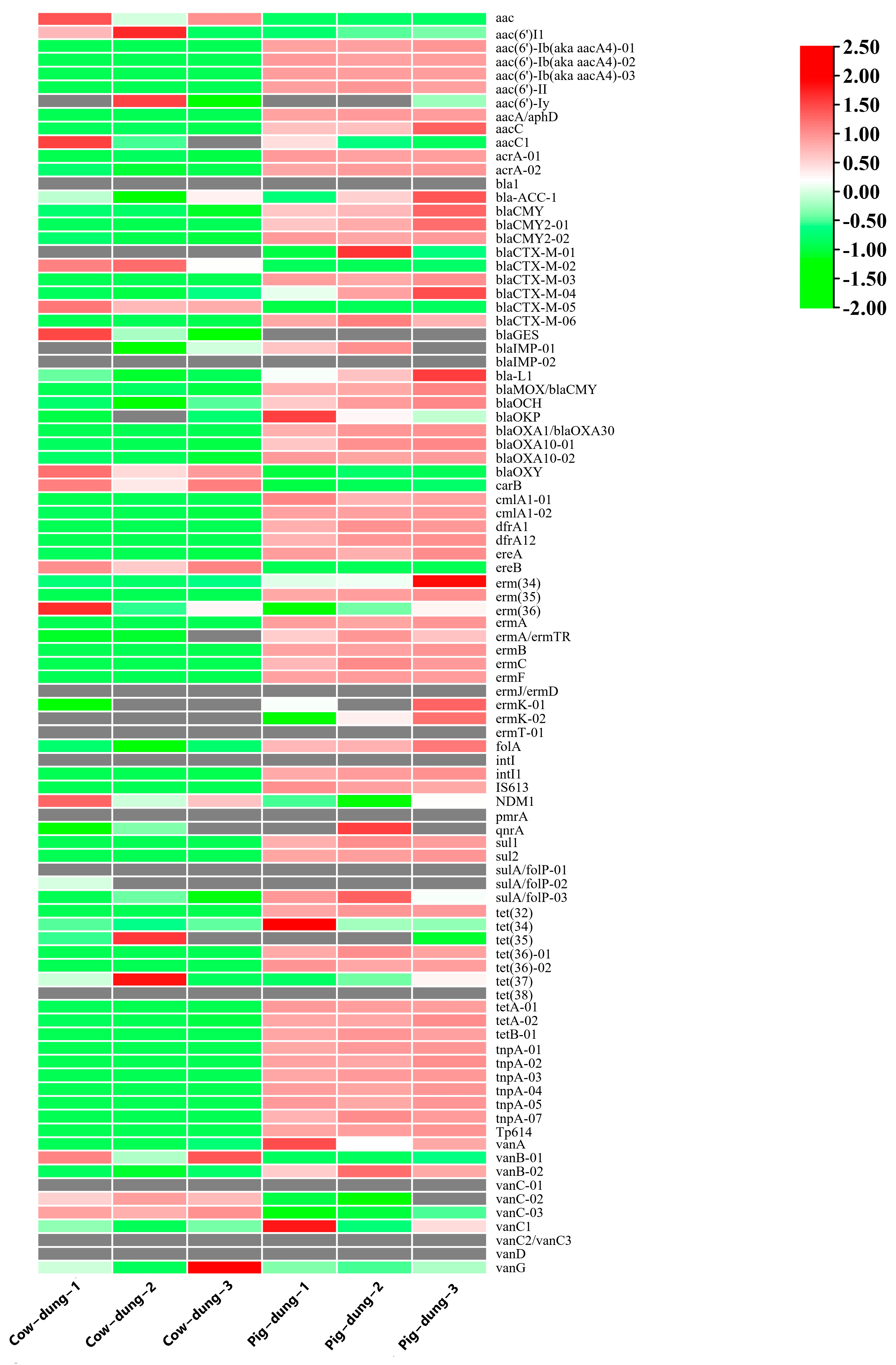 3.2. Differentially Expressed ARGs Between Cow and Pig Dung Samples