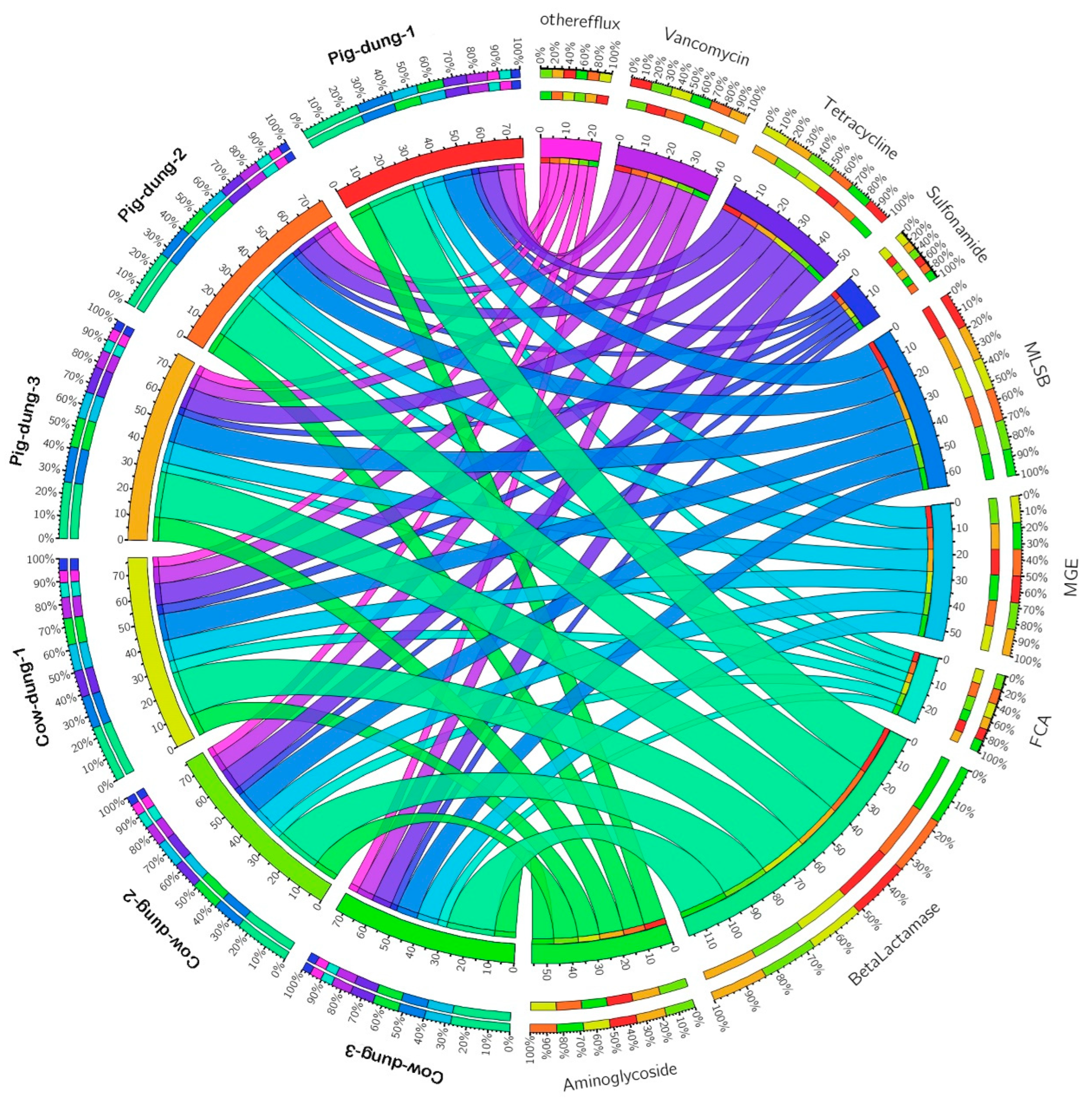 3.1. Analysis of Microbial ARGs in Cow and Pig Dung Samples