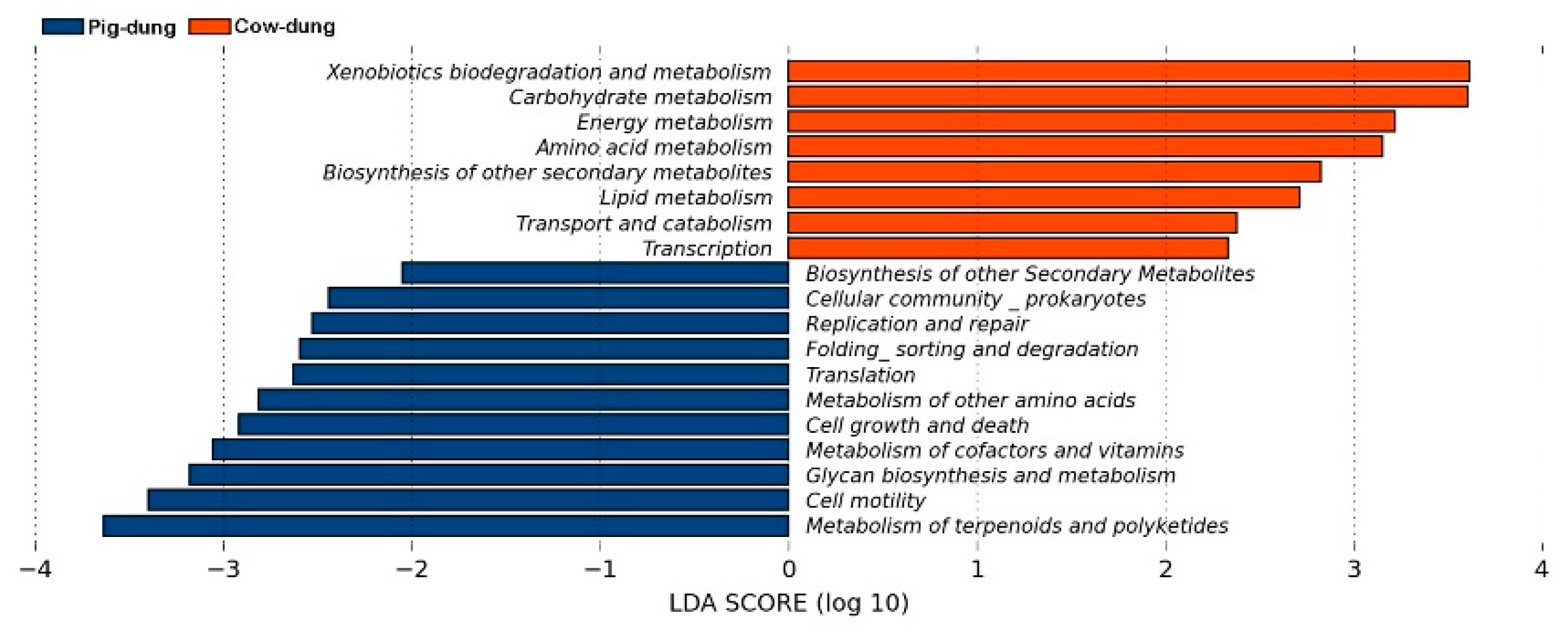 3.7. Analysis of Metabolic Pathways Between Cow and Pig Dung Samples