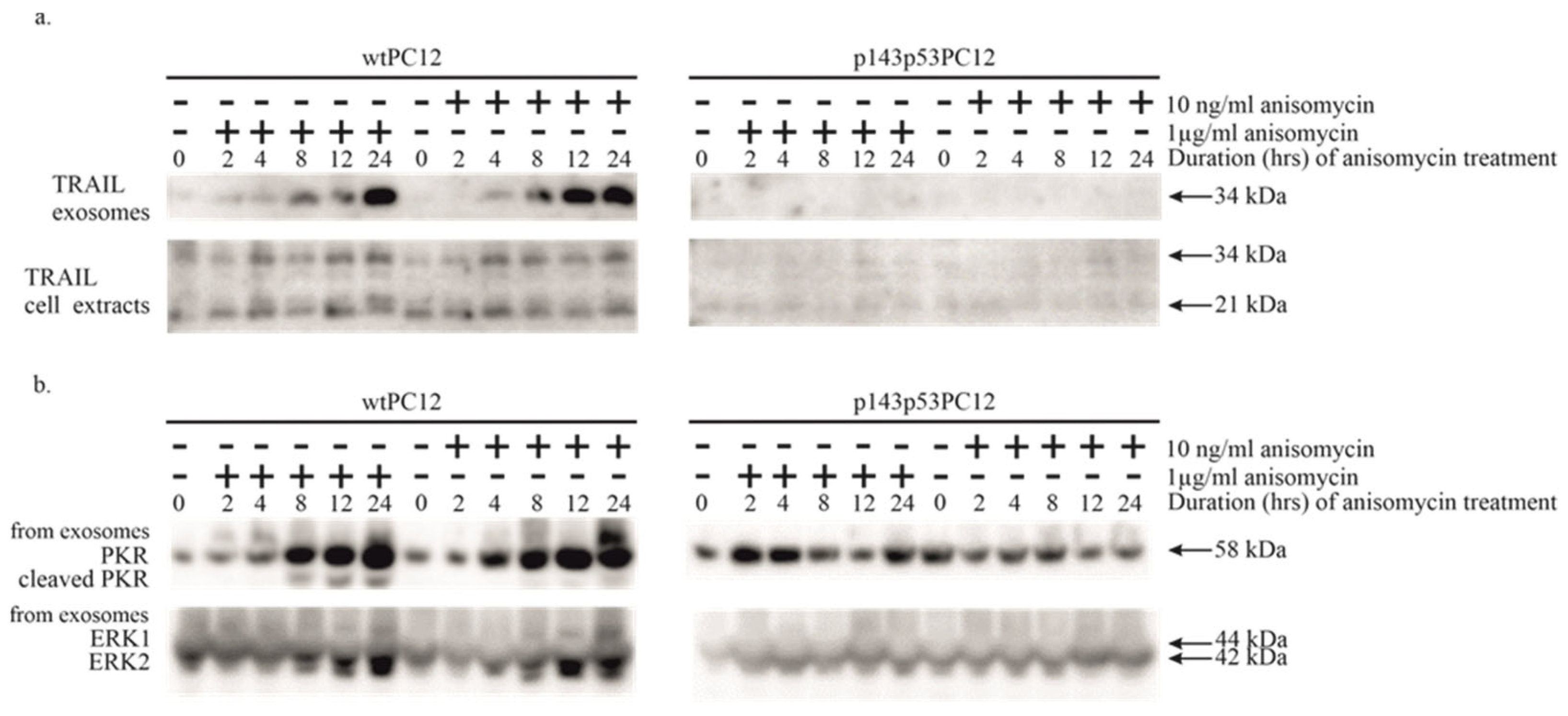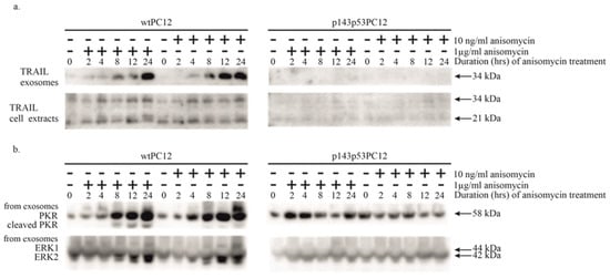 In addition to the transmembrane isoform of TRAIL, the PKR content of exosomes was similarly increased (Figure 3b). Neither intracellular TRAIL nor PKR levels were affected by anisomycin treatment (compare Figure 1b and Figure 3b), indicating the existence of a selective exosomal accumulation mechanism for these proteins. (The complex regulatory mechanisms governing exosome biogenesis and release, as well as cargo selection (as reviewed in [44]), are planned to be explored in future studies.) The exosomal changes were not detected in p143p53PC12 cells: TRAIL expression was almost completely absent, while changes in exosomal PKR expression were not observed. It can thus be concluded that the exosomal transfer of these stress-related proteins is completely under the control of the p53 protein, and as judged by the ERK loading control, even the production of exosomes is affected by the p53 protein. The cellular mechanism of these regulatory processes is at present unknown.
