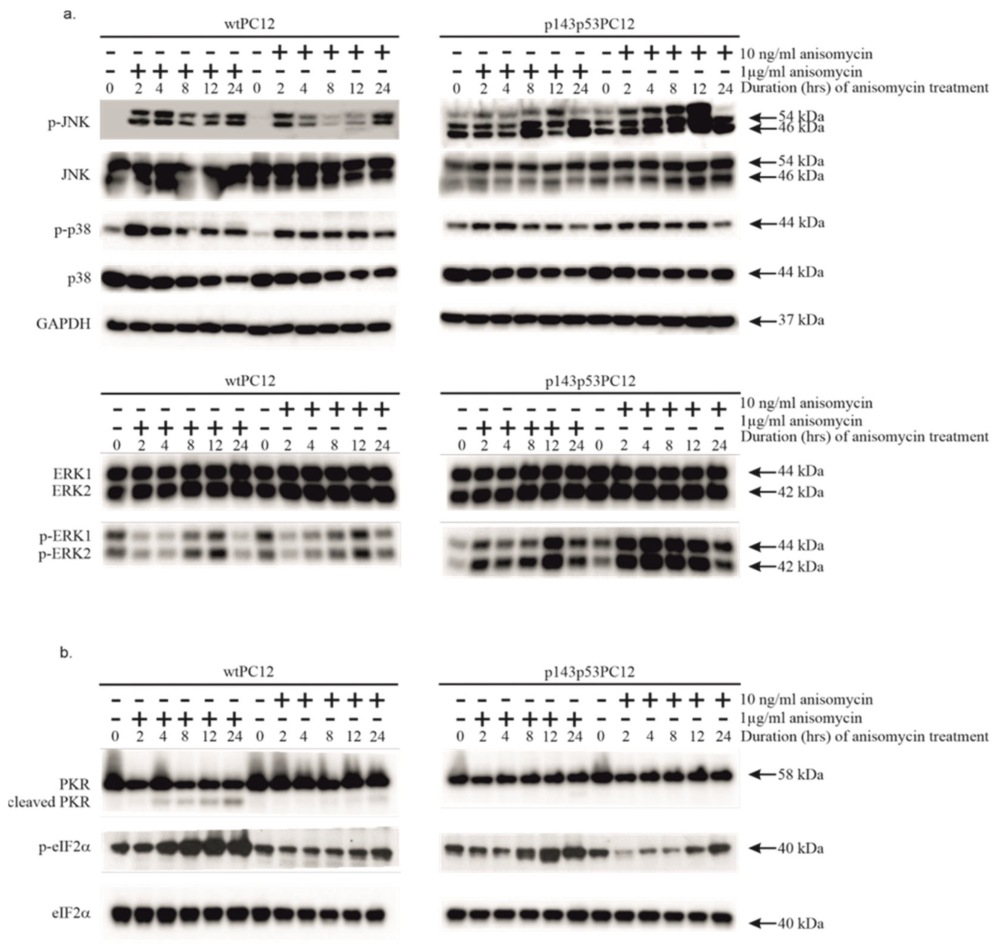The effect of anisomycin treatment on various stress signaling proteins of wtPC12 and p143p53PC12 cells. Cell cultures were treated with high (1 µg/mL) or low (10 ng/mL) concentrations of anisomycin for the periods indicated in the headings of the figure. Cell extracts were subjected to Western-blot analysis as described in Materials and Methods using antibodies against proteins of the mitogen-activated protein kinase pathways (a) and the PKR-eIF2α pathway (b). Anti-GAPDH was used as a loading control. Densitometric quantification of Western blot bands is shown in the Supplementary Materials (File S2).