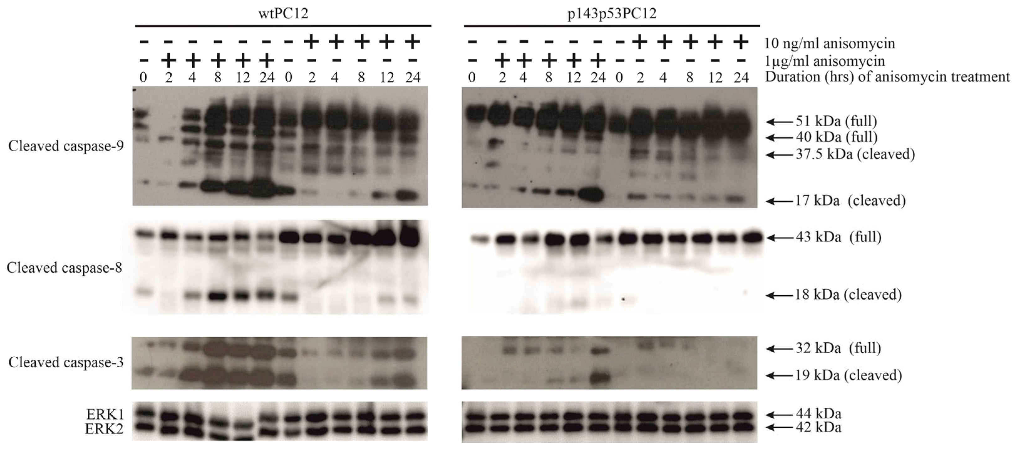 Anisomycin-induced caspase activation in wtPC12 and p143p53PC12 cells. The experiment was carried out as described in the legend to Figure 1. Anti-ERK1/ERK2 antibody was used as a loading control. Densitometric quantification of Western Blot bands is shown in the Supplementary Materials (File S2).