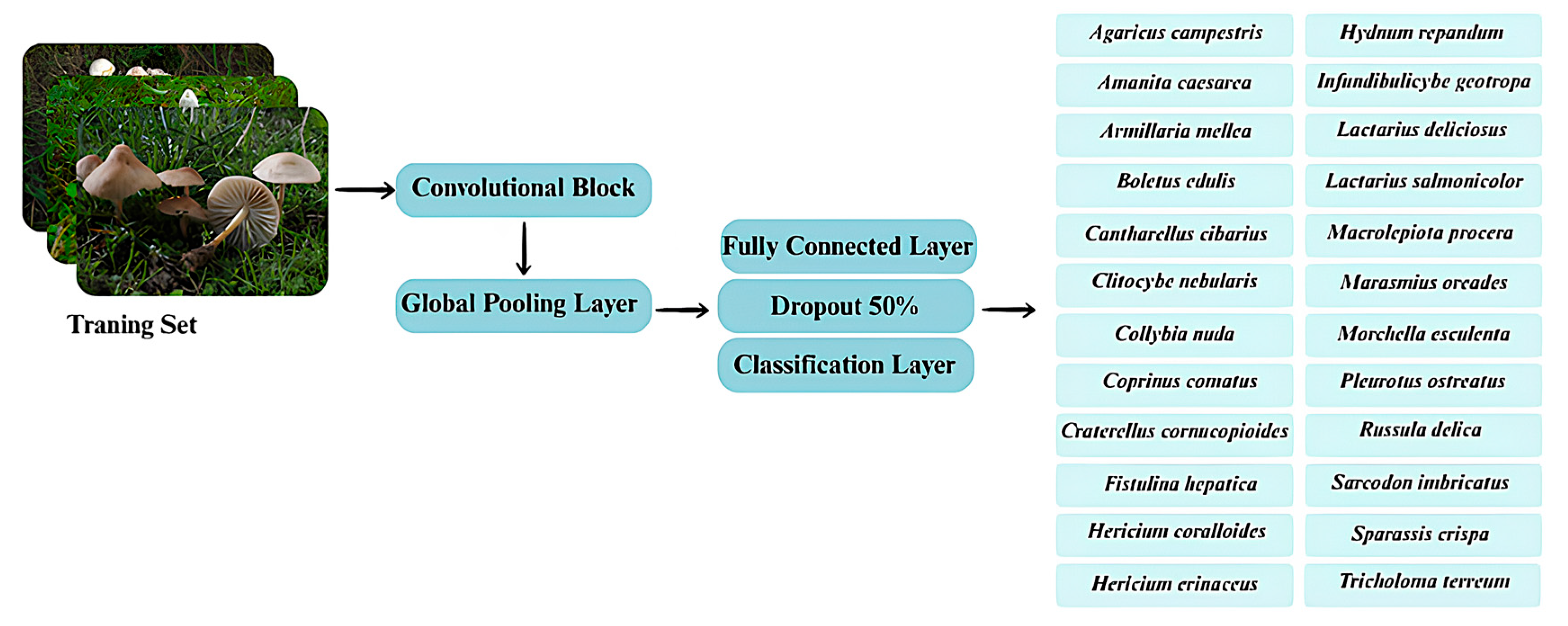 41]. Pre-trained convolutional neural networks trained on the ImageNet dataset served as the backbone architectures. Leveraging these weights allowed the model to utilize a hierarchy of visual features from low-level edges and textures to more complex shapes before fine-tuning on the mushroom dataset. This approach significantly reduced the computational cost and training time while preserving high representational power. By integrating rigorous data curation, comprehensive augmentation, and transfer learning, the dataset was transformed into a robust and balanced foundation for deep learning. This preparation ensured that the models could achieve strong generalization capabilities, minimizing overfitting while maintaining high classification accuracy across diverse macrofungi species [