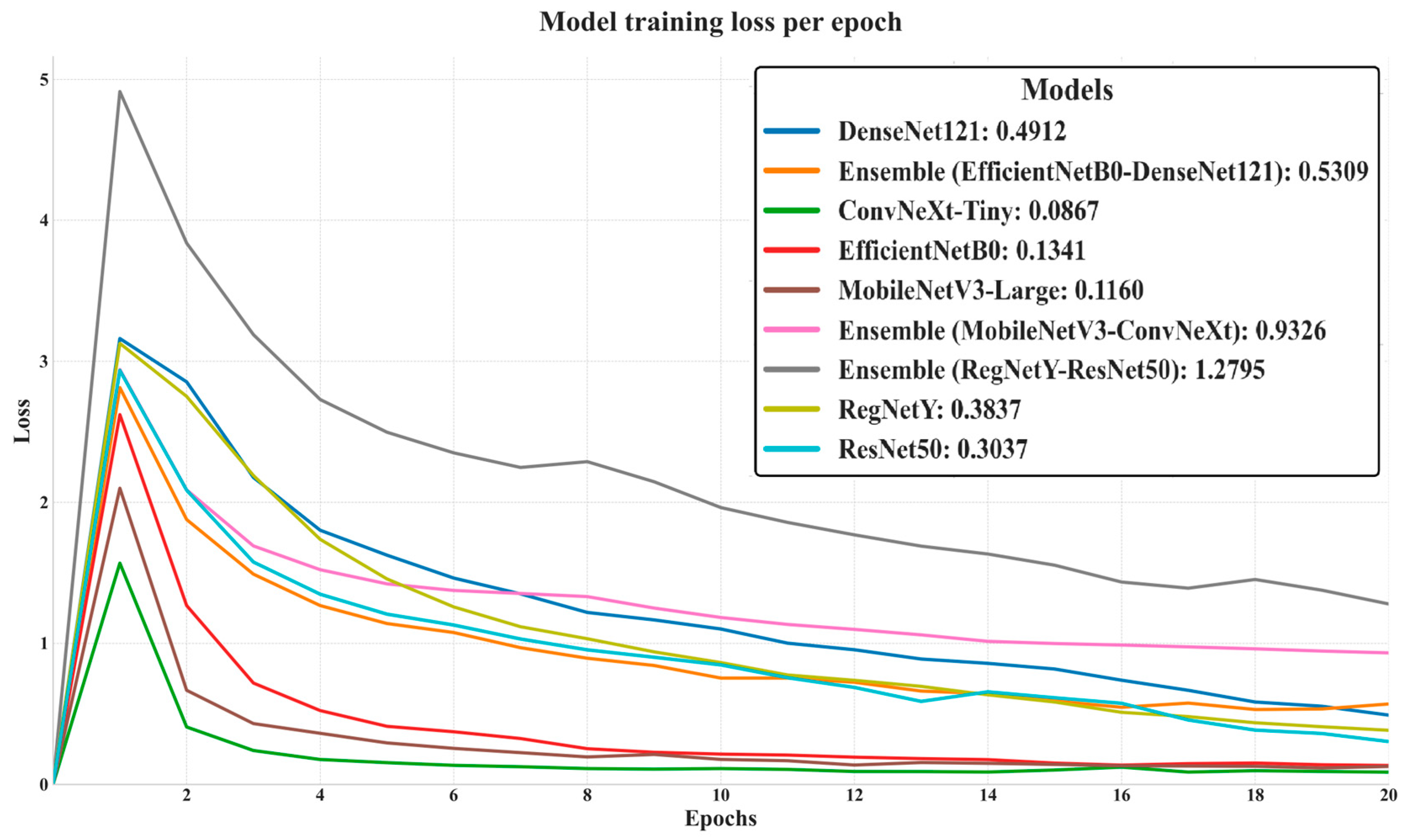Figure 5 illustrates the evolution of training loss for all evaluated models over 20 epochs, offering insight into their convergence behavior, optimization stability, and learning efficiency. Models such as ConvNeXt-Tiny (final loss: 0.0867), MobileNetV3-Large (0.1160), and EfficientNetB0 (0.1341) achieved the lowest final training losses, indicating rapid convergence and highly efficient feature learning during training. ResNet50 (0.3037) and RegNetY (0.3837) also demonstrated stable and consistent loss reduction, though at slightly higher final values. In contrast, the Ensemble (RegNetY–ResNet50) exhibited the highest final loss (1.2795) and the slowest decline, suggesting optimization inefficiencies and possible architectural incompatibilities that hindered effective joint learning. The initial sharp spike in loss during the first epoch most pronounced in the Ensemble (RegNetY–ResNet50) reflects the model adaptation phase, after which most architectures stabilized and steadily improved. Overall, this loss analysis complements the training accuracy trends, with models achieving low final losses generally corresponding to those with higher training accuracy, reinforcing the relationship between optimization efficiency and learning capacity.